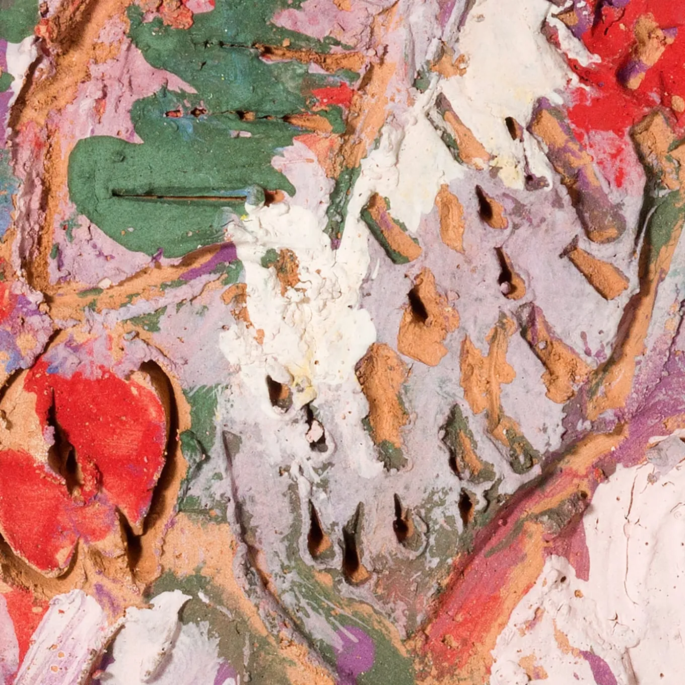 Intitolata “Emozioni”, questa tavoletta rettangolare di argilla è dipinta nei toni terrosi del bianco, del verde e del rosso e ornata da fori incisi che imitano la consistenza porosa e il profumo della terra. L’opera evoca un’esperienza sensoriale, collegando lo spettatore al mondo naturale.
