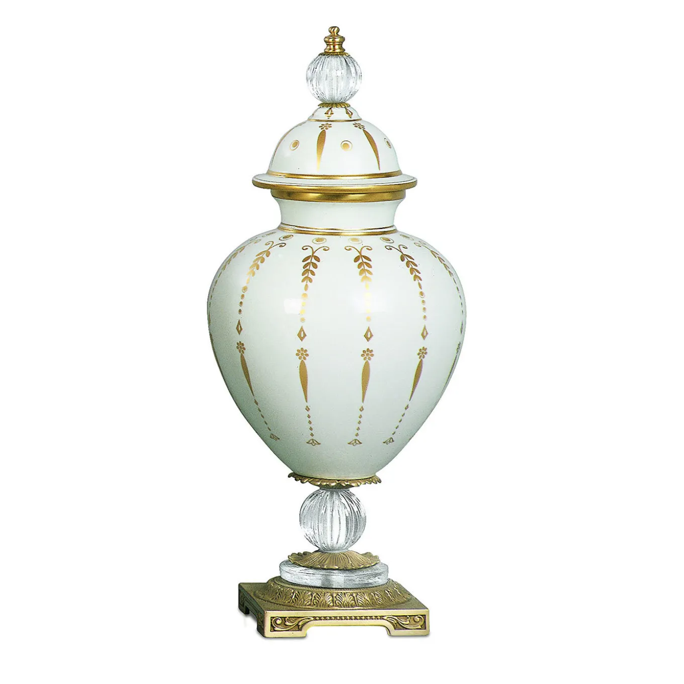 Questa lussuosa potiche è un must elegante e raffinato per qualsiasi arredamento classico, dalle consolle ai comò. Poggiata su una base quadrata con piedi, in metallo dorato e intricato con motivi barocchi, il suo corpo arrotondato è ornato da decorazioni floreali dorate che si estendono anche al coperchio a cupola. Inserti in vetro con texture a coste impreziosiscono la base e il coperchio come preziosi terminali.