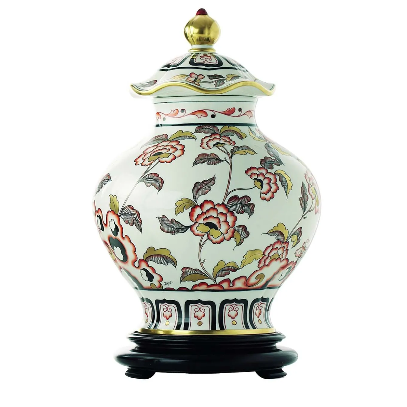 Racchiudendo l’incantevole fascino della tradizione decorativa cinese, questa sofisticata potiche presenta una silhouette sinuosa riccamente decorata con le tipiche decorazioni floreali. Poggia su una base a piedini e a gradini ed è sormontata da un prezioso coperchio ravvivato da un terminale sferico dorato e da un bordo ondulato.