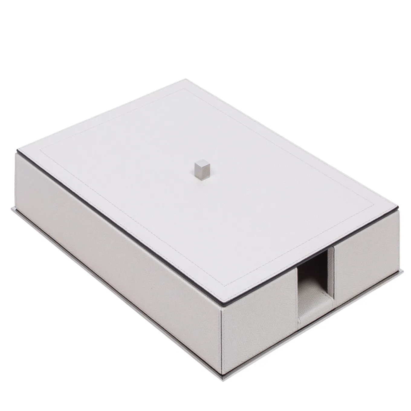 Questa elegante scatola è un pezzo d’accento da aggiungere alla scrivania e offre un ampio spazio di archiviazione per i fogli A4. La sua silhouette minimalista comprende una scatola rettangolare che poggia su una base di metallo spazzolato con finitura in ottone e un coperchio, entrambi gli elementi rivestiti in pelle bianca con cuciture tonali. Un’apertura nella parte anteriore consente di accedere alla scatola senza aprire il coperchio. Il metallo è disponibile anche nelle finiture cromo o bronzo.