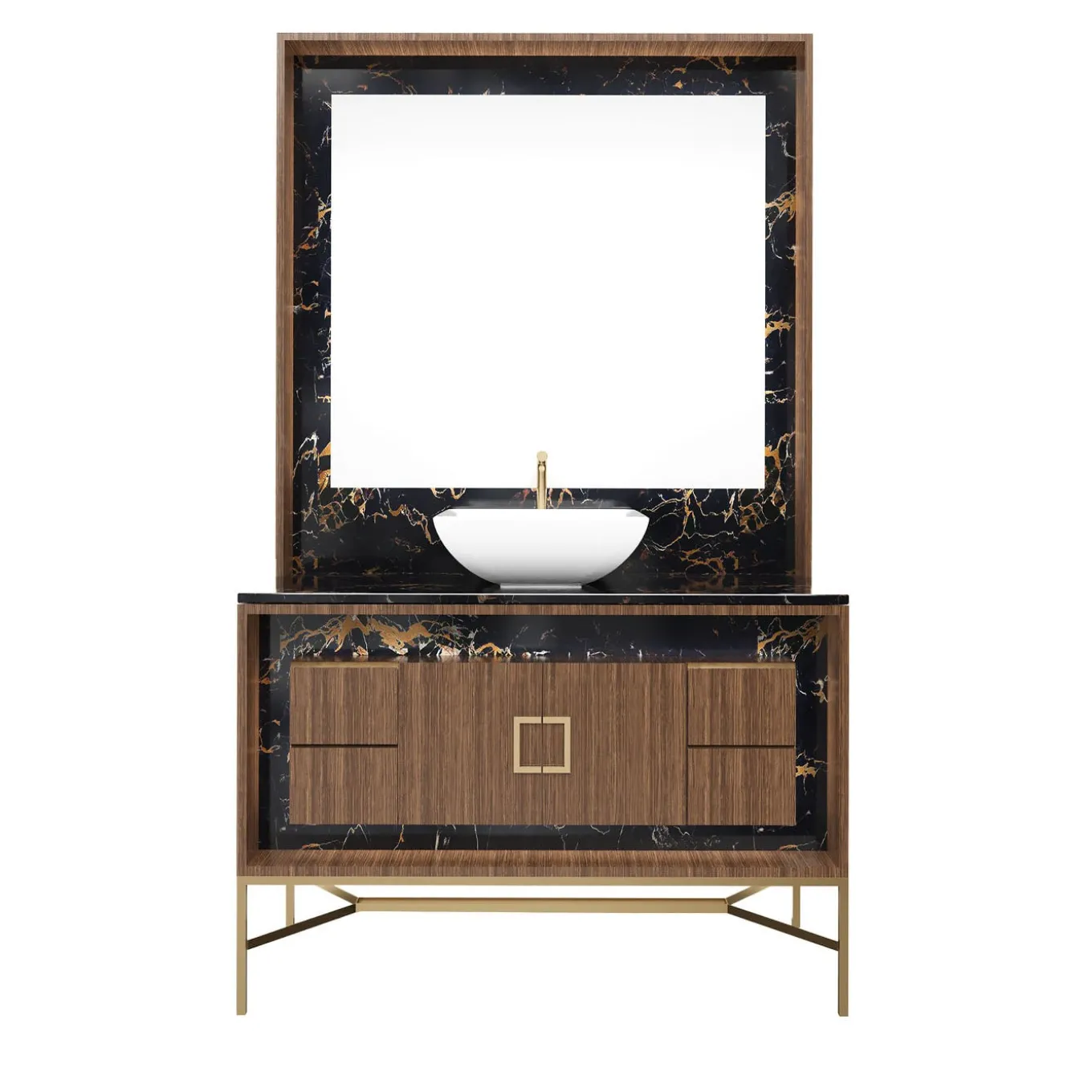 Il mobile da bagno in legno e marmo Frame S Port Laurent presenta una struttura in legno massiccio di medie dimensioni con un caratteristico effetto architettonico 3D. È abbinato a un piano in marmo di alta qualità che include un lavabo integrato per una perfetta integrazione nel design. Le maniglie progettate su misura fungono da portasciugamani, unendo praticità ed estetica raffinata. Il mobiletto poggia su un’elegante base in metallo con finitura dorata, che ne esalta il fascino sofisticato e le funzionali possibilità di contenimento. Il lavello e la rubinetteria non sono inclusi.