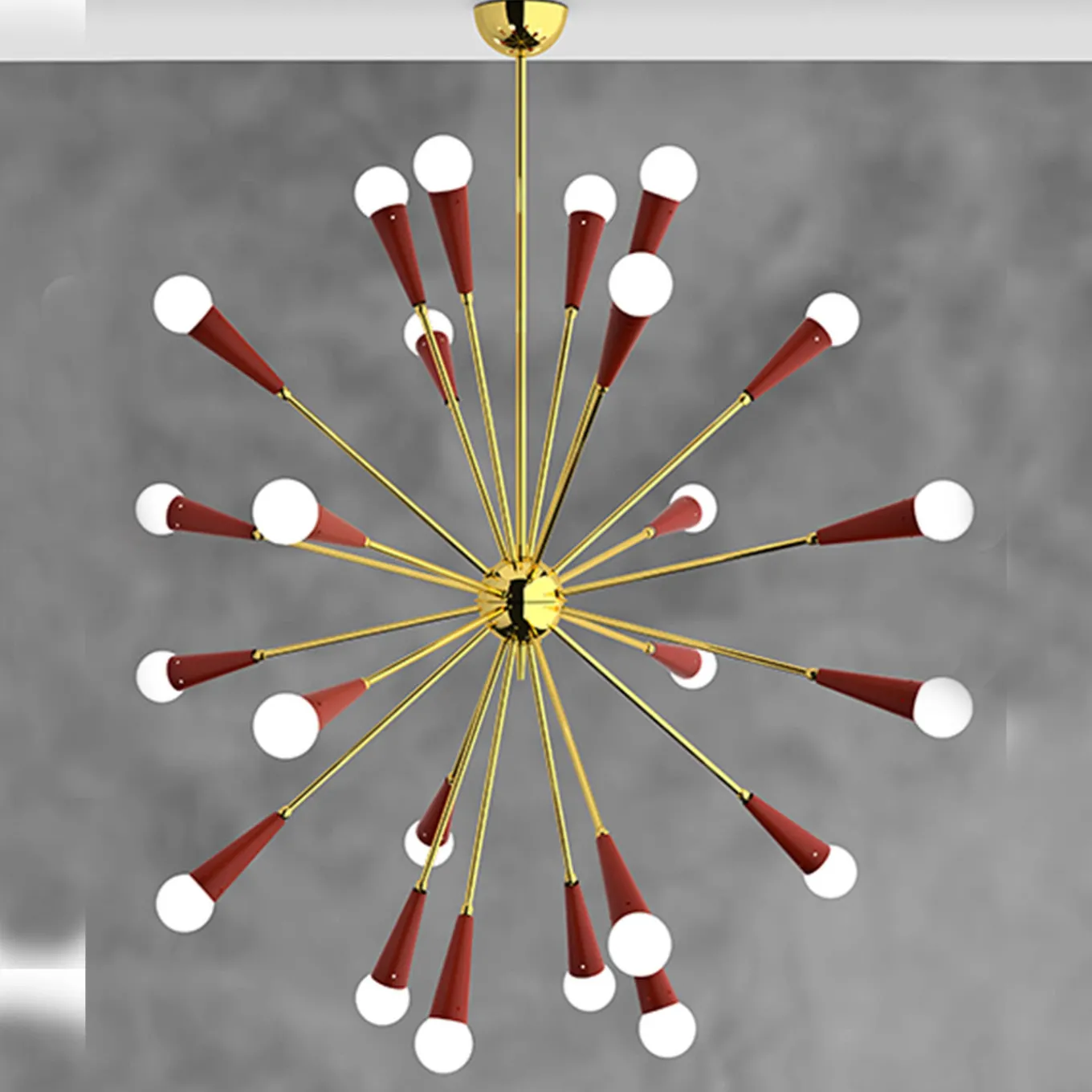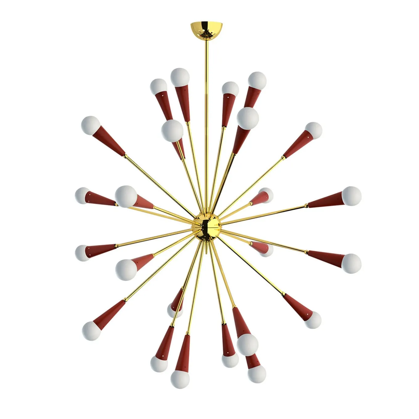 La meraviglia di alzare gli occhi al cielo e avere la fortuna di guardare una galassia ha ispirato il design davvero esplosivo di questo lampadario, il cui gruppo di sorgenti luminose corona le estremità di raggi in ottone lucido. Montati su coni con finitura rossa, i vetri opalini soffiati a bocca fungono da diffusori e irradiano la loro luce senza ostacoli nell’ambiente circostante. Nel catalogo Artemest sono disponibili diverse opzioni e varianti di colore.