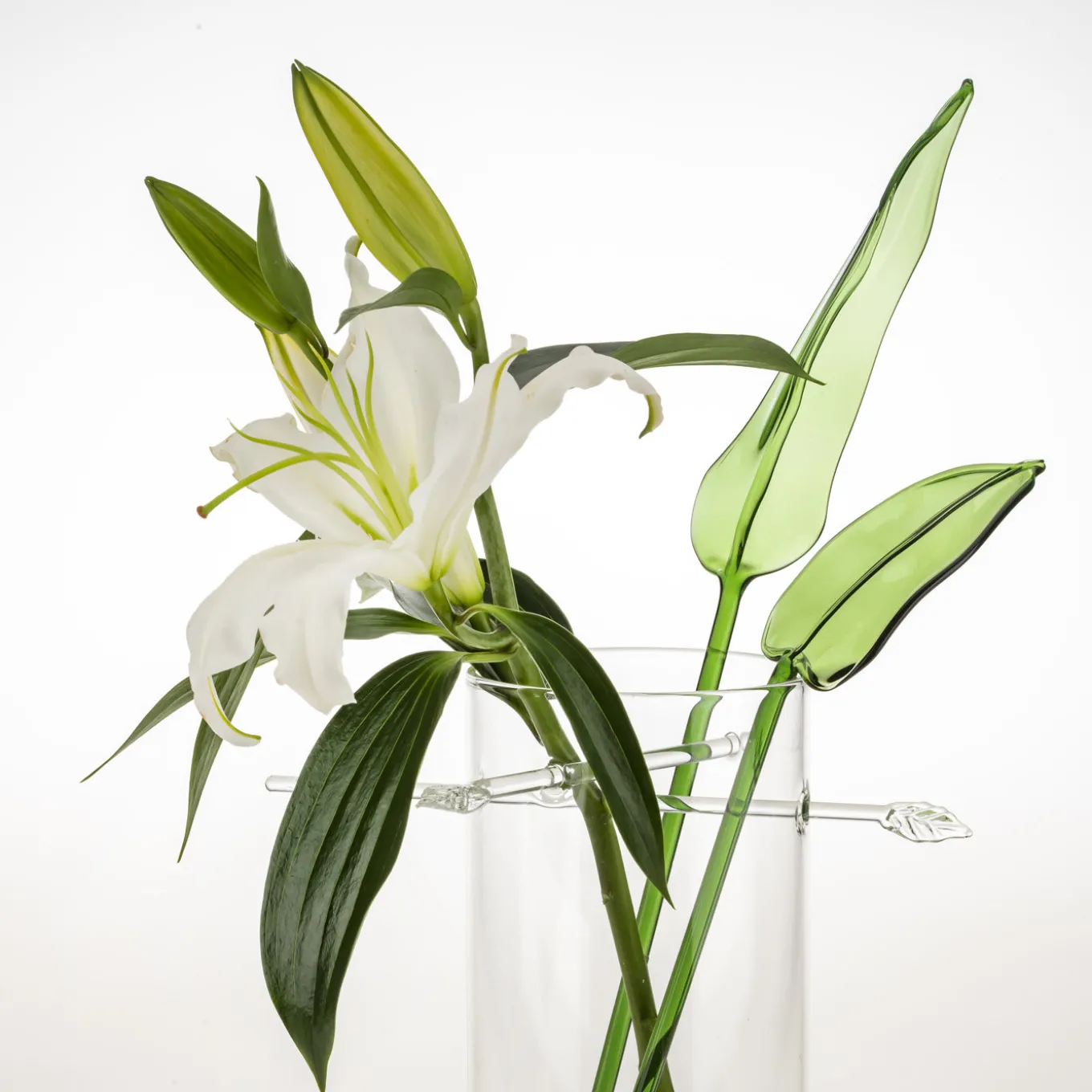 Ispirato all’acconciatura tradizionale delle donne giapponesi, questo vaso è uno squisito esempio di estetica moderna e di artigianato tradizionale, che si inserisce in modo accattivante nell’arredamento di un salotto o di un ingresso moderno. Realizzato in vetro trasparente soffiato a bocca, presenta una forma alta e cilindrica con due sottili aste inserite nei fori intorno al bordo per contenere le due foglie a stelo lungo che ricordano la vegetazione tropicale. Da esibire come centrotavola all’ingresso o sul tavolino del salotto, questo eccezionale vaso è disponibile in altre tre dimensioni.