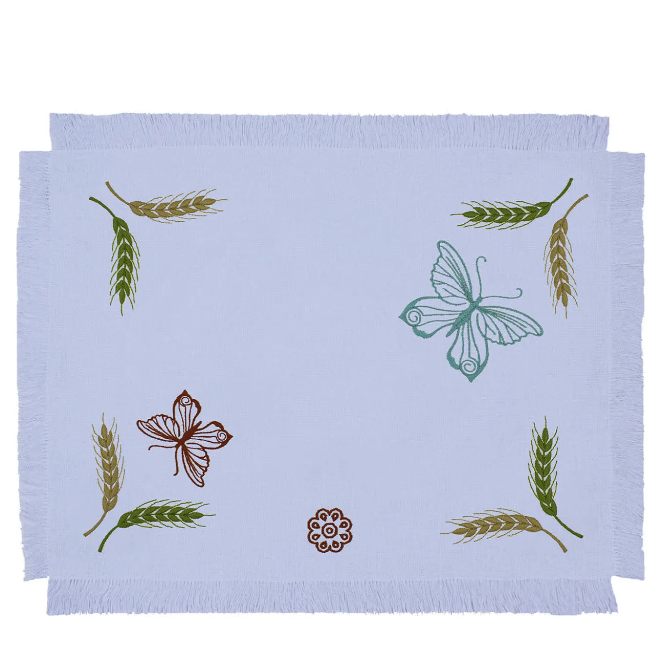Farfalle e spighe – simboli di rinascita – compongono i minuziosi ricami colorati che i maestri artigiani hanno realizzato per molte ore sulle due tovagliette che compongono questo set. Realizzate in lino azzurro certificato Masters of Linen e ricamate in pregiato cotone Mako, ogni tovaglietta è chiusa da frange laterali che ne esaltano l’estetica raffinata. Sono disponibili diverse opzioni di colore.