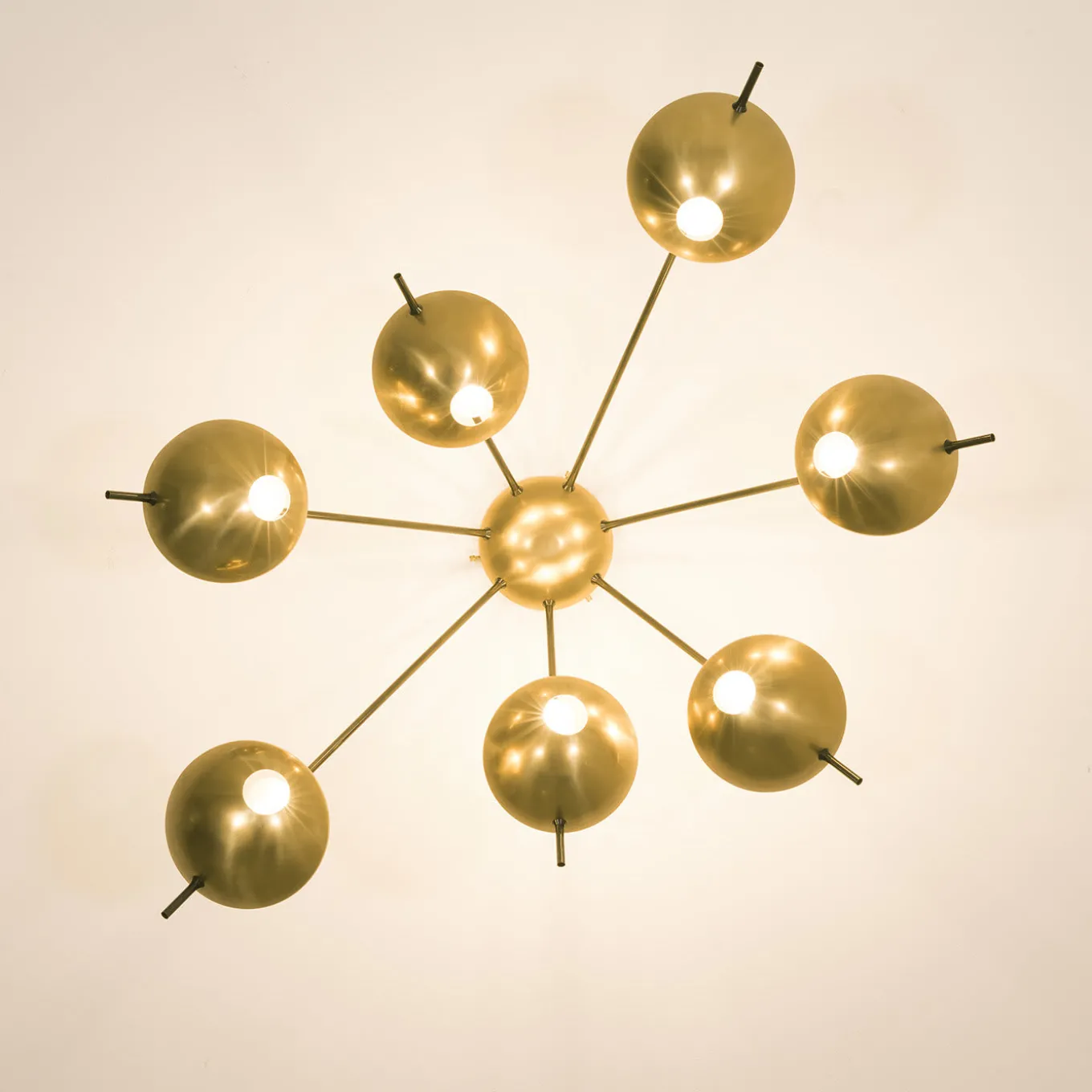 Parte della collezione di lampade da soffitto e da parete Helios, questo pezzo può essere utilizzato sia per abbellire che per illuminare un interno contemporaneo. Elegante nella sua semplice ma dinamica silhouette in ottone ispirata alla meridiana, presenta un elemento centrale che sostiene sette steli che terminano ciascuno con un paralume semisferico. Disponibile in altri colori, è compatibile con lampadine a incandescenza e LED (non incluse) e può essere cablata per il Nord America (110V 60 Hz – lampadine con attacco E26) o per l’Europa (220V 50Hz – lampadine con attacco E27).