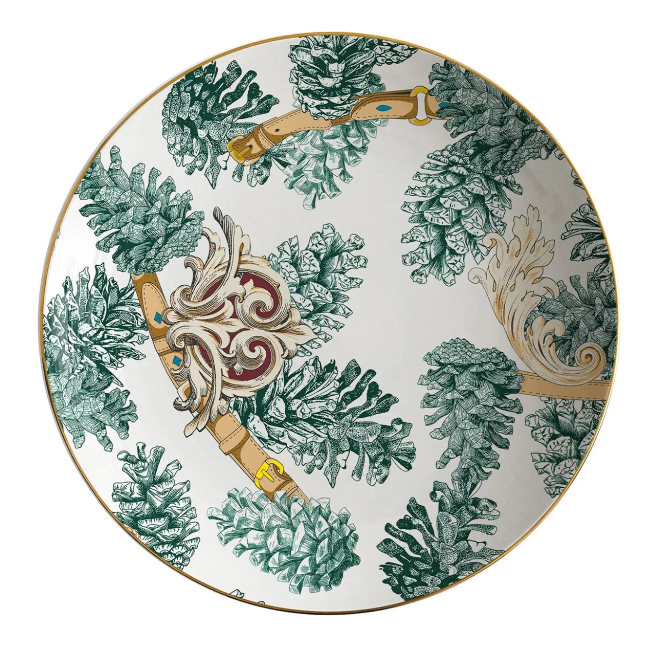 La collezione Big White è dedicata al Natale e alla sua magia. Il design di questo piatto fondo è costituito da un intreccio di pigne e steccati con dettagli in oro. I colori tipici del Natale sono qui raccolti e utilizzati per raccontare la tradizione e l’immaginario romantico che porta con sé in modo elegante e d’impatto.