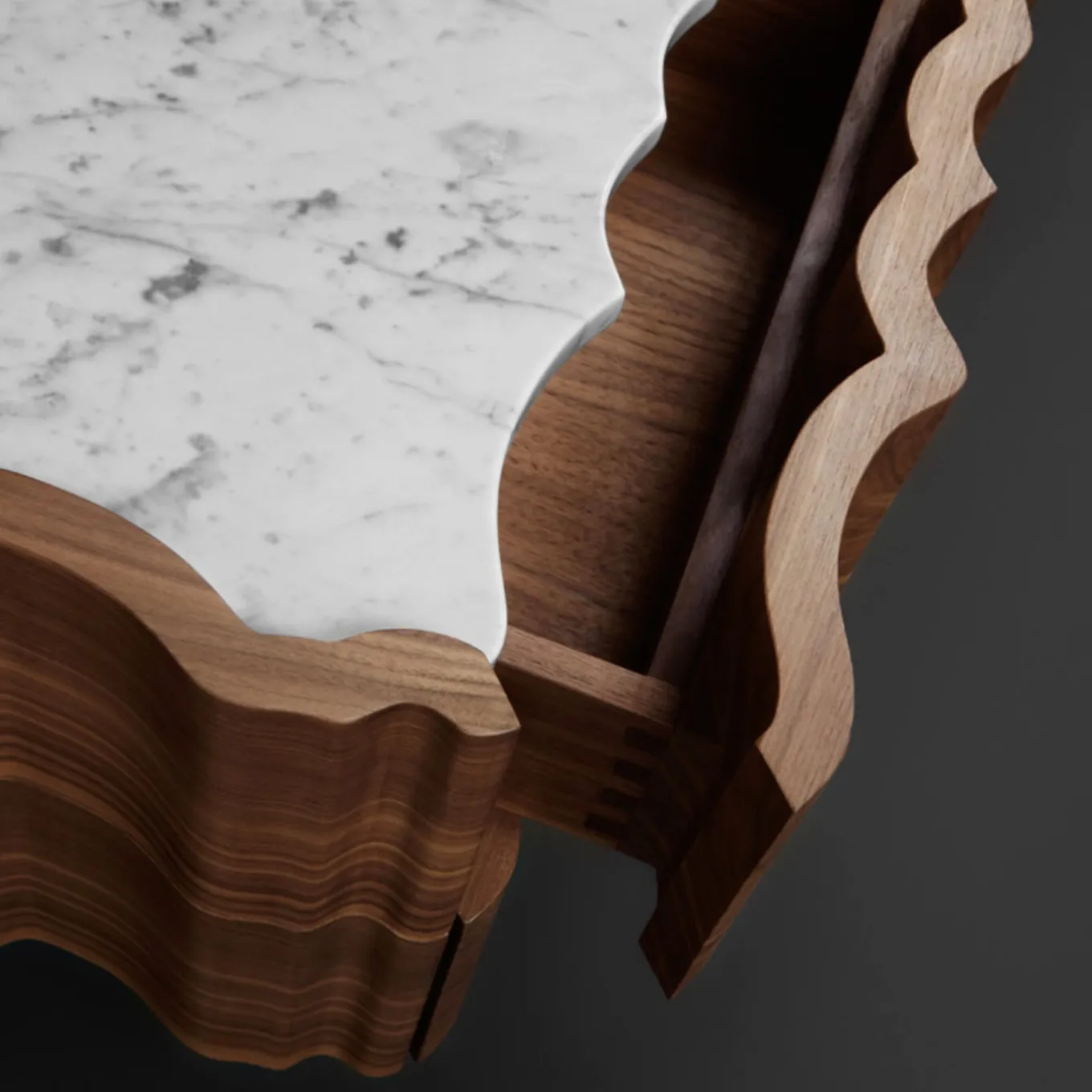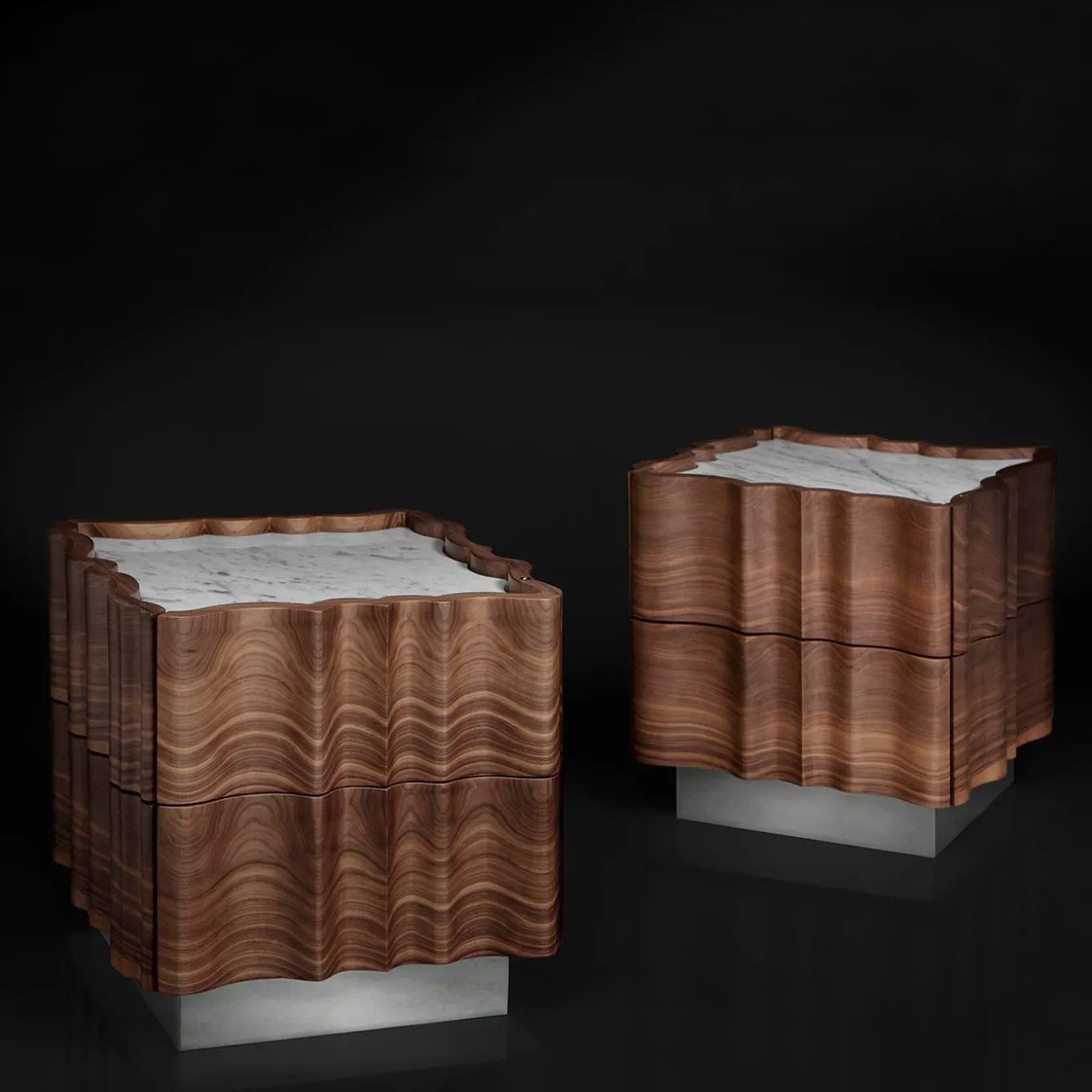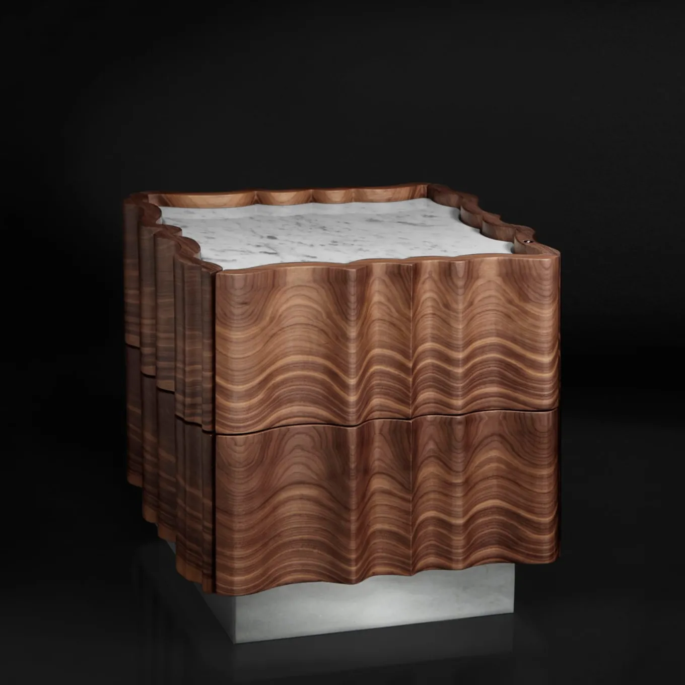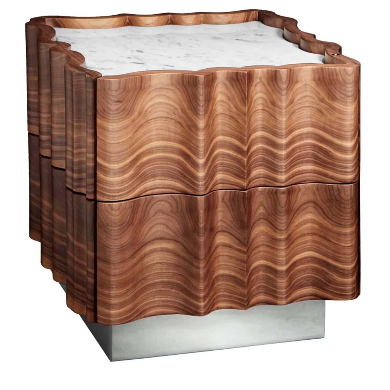 Il Pezzo 2 Comodino ha una forma classica e sinuosa. Il piano è una bella lastra di marmo bianco di Carrara, la base è in ottone, mentre il noce, ricavato da un unico pezzo, mostra le sue magnifiche venature. In ogni pezzo un piccolo cilindro di ottone con un numero personalizzato ne attesta l’unicità e l’autenticità. Questo pezzo può essere realizzato su misura nelle dimensioni e nelle finiture desiderate.