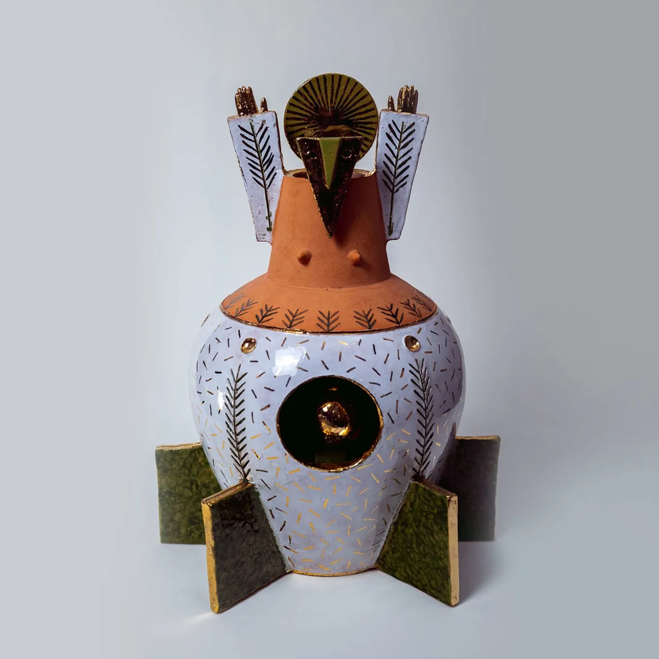 Moda, design e artigianato sono tutti celebrati in questa scultura in ceramica unica nel suo genere, il cui design vagamente antropomorfo rappresenta la visione personale di Sandro Lorenzini del Signore del Sole. Dettagli in oro scintillante arricchiscono il pezzo, che presenta un vivace motivo di tratti sparsi e dettagli a spina di pesce su uno smalto bianco brillante. I raggi alla base ne suggellano lo spirito fantastico.