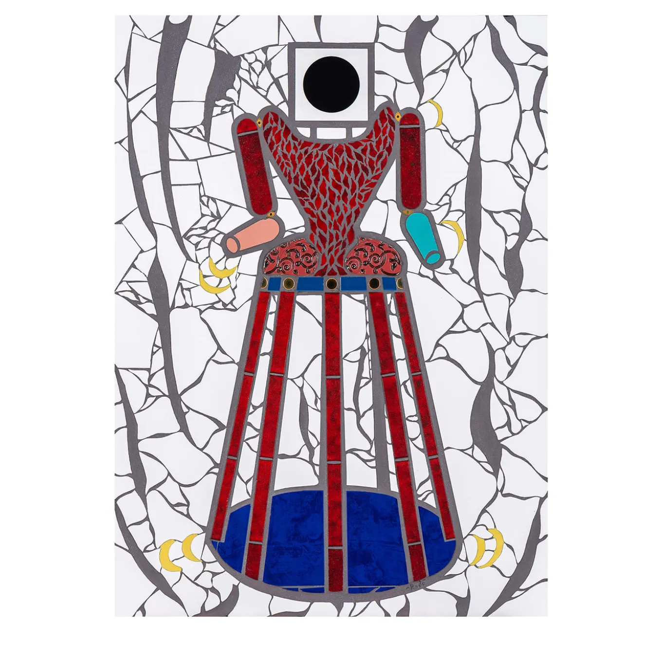 Una versione robotica e androide della Vergine Maria è il soggetto eccentrico e provocatorio di questo singolare mosaico, elemento centrale di un trittico ispirato al racconto “A Boccaperta” che Carmelo Bene scrisse su San Giuseppe da Copertino. Inserti torniti arricchiscono il trionfale assemblaggio di tessere ceramiche e gesso che delineano la figura vagamente antropomorfa. Il certificato di autenticità è allegato all’acquisto.