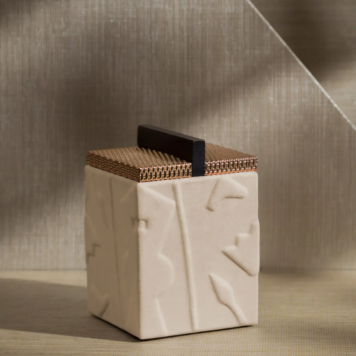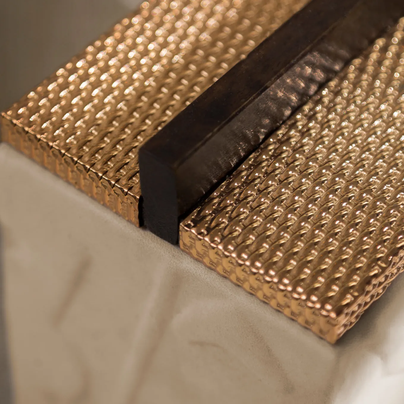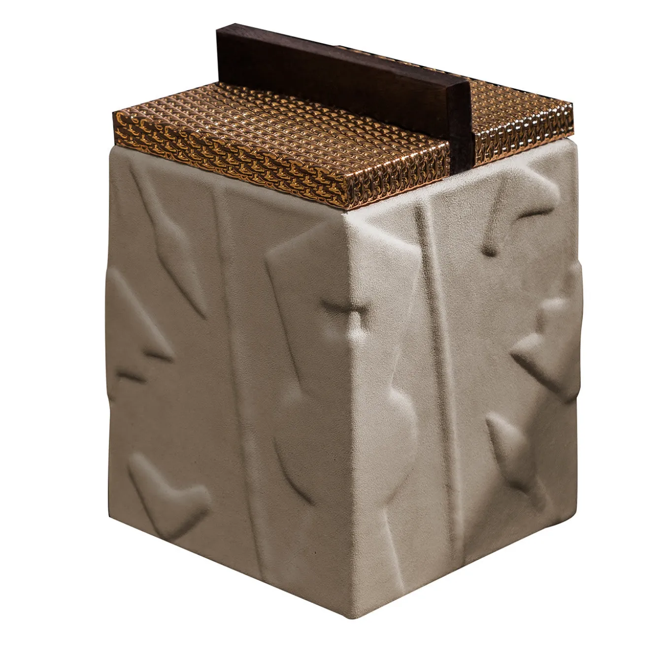 Questo incantevole cofanetto della collezione Bacabs fonde funzionalità e fascino decorativo, consentendo di elevare qualsiasi superficie, da vanity a scrivanie raffinate. Soggetti presi in prestito dall’arte precolombiana hanno ispirato il motivo in rilievo che aggiunge un tocco di texture alla struttura in massello di noce canaletto, che è infine avvolta in pregiata pelle Nubuck beige per una sensazione tattile superba. Il manico lineare in legno riecheggia il razionalismo e fa da contrappunto alla lucentezza conferita dal coperchio a rete con finitura in ottone.