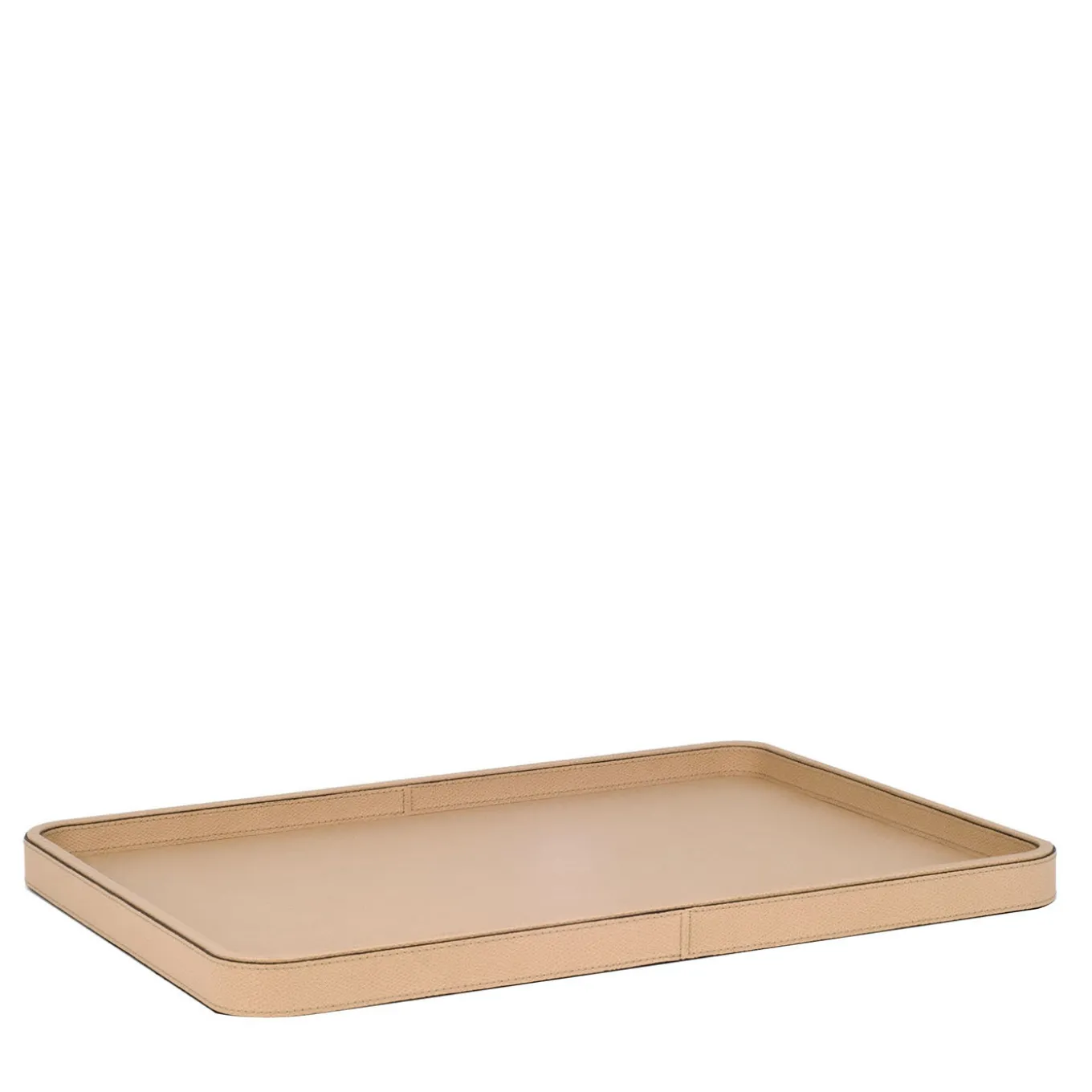 Completamente rivestito in pelle pregiata in una calda tonalità di marrone nocciola, questo superbo vassoio con angoli arrotondati completerà con eleganza la scrivania di uno studio privato o la credenza di un salotto moderno. Può essere utilizzato per servire le bevande o per ospitare oggetti da collezione permanenti con la stessa facilità. Disponibile in altre tre dimensioni e in una variante quadrata, questo design è personalizzabile in tutte le opzioni di finitura del catalogo, contattando il Concierge.
