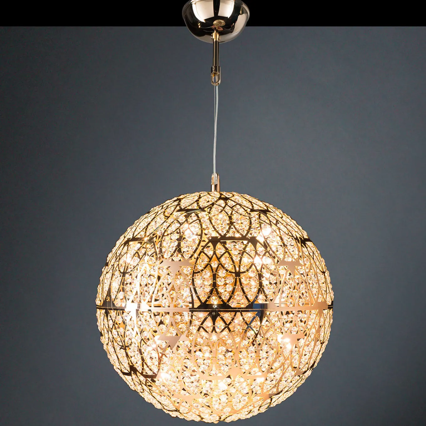 Superbo oggetto di arredamento funzionale, questa lampada a sospensione celebra la luce in una perfetta forma sferica. È realizzata con elementi in acciaio cromato lucido, che fungono sia da struttura portante che da supporto per la miriade di cristalli sfaccettati applicati a mano che ne ricoprono la superficie. La luce che emana dalle 12 lampadine LED G9 3W creerà un effetto magico in qualsiasi stanza della casa. Altre finiture e dimensioni del metallo possono essere richieste contattando il Concierge. Certificazioni commerciali e contrattuali disponibili su richiesta.