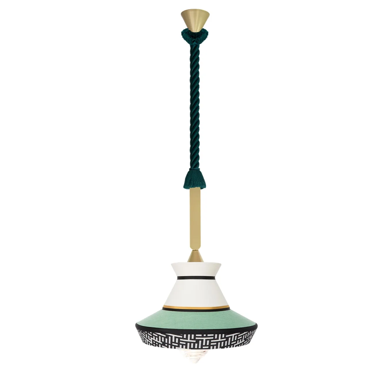 Calypso outdoor è un prodotto con grado di protezione IP65, quindi un vero e proprio Outdoor. I tessuti impermeabili e ignifughi sono adatti a resistere agli agenti atmosferici a temperature particolarmente alte o basse, mantenendo i colori e la qualità artigianale del prodotto. I cavi elettrici passano attraverso la corda marina di colore verde e la struttura portante, che è costituita da un massello levigato laccato oro opaco. La sorgente luminosa è alloggiata all’interno di un cilindro di vetro sigillato per garantire il grado di protezione IP65. Il diffusore è in vetro trasparente. Sorgente luminosa: 1 X E27 T8 Tubolare a LED ip65.