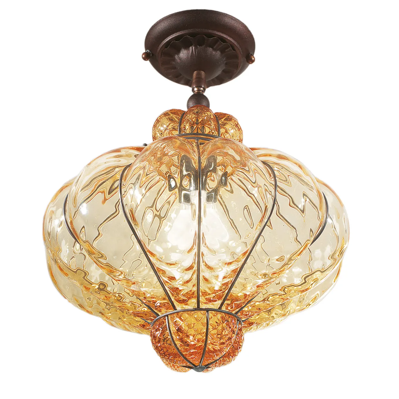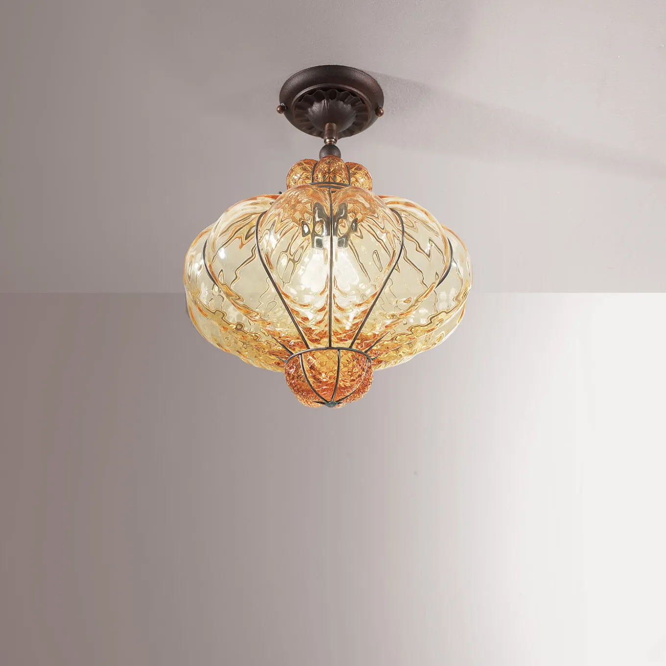 Riflettendo la grandezza dei nobili palazzi dove un tempo vivevano i sultani, questa meravigliosa lampada a sospensione è un’interpretazione moderna di tradizionali e opulenti lampadari. Il vetro trasparente color ambra che si gonfia attraverso i raggi della gabbia raggiunge la sua forma finale grazie a una raffinata fase di soffiatura a bocca. Completata da una robusta rosetta da soffitto, cattura il lusso senza tempo degli artefatti in vetro di Murano con sottili riferimenti industriali. A causa della natura artigianale del processo, potrebbero verificarsi leggere variazioni. La finitura del metallo e la tonalità del vetro possono differire da pezzo a pezzo, accentuando l’unicità di ogni creazione.