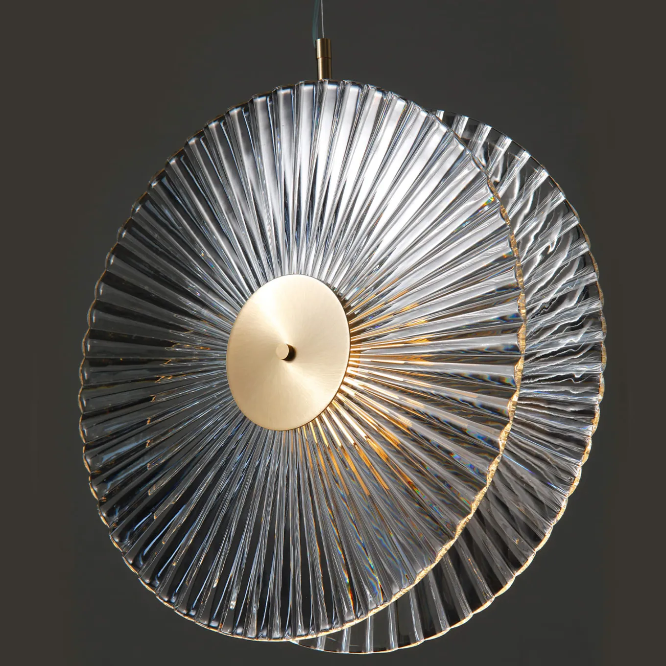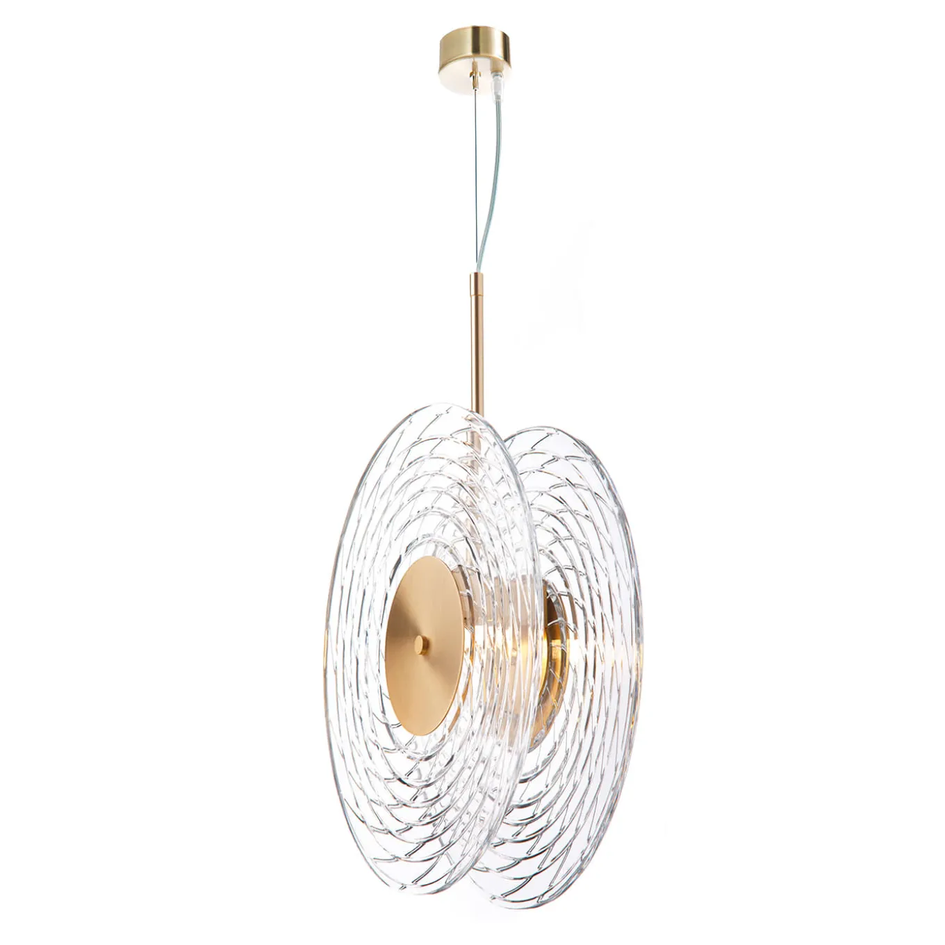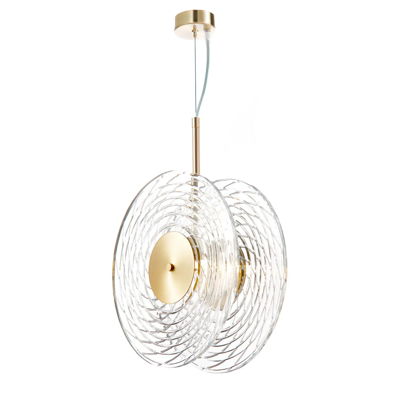 La lampada a sospensione Yo-Yo è un affascinante design moderno ispirato alla forma dell’omonimo giocattolo. Appesi a una piastra rotonda da soffitto in metallo dorato, in linea con la struttura che li tiene uniti, due dischi di cristallo compongono lo straordinario paralume di questo pezzo iconico, inciso a mano in un sublime motivo geometrico.