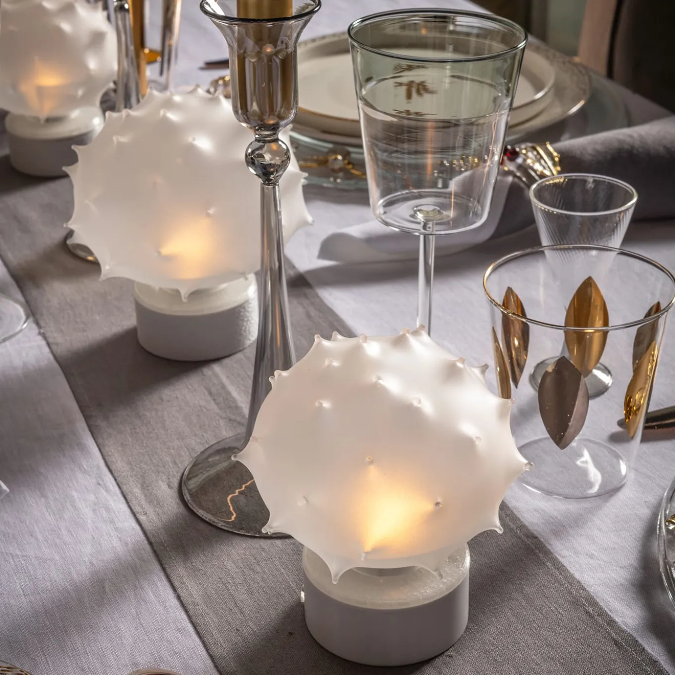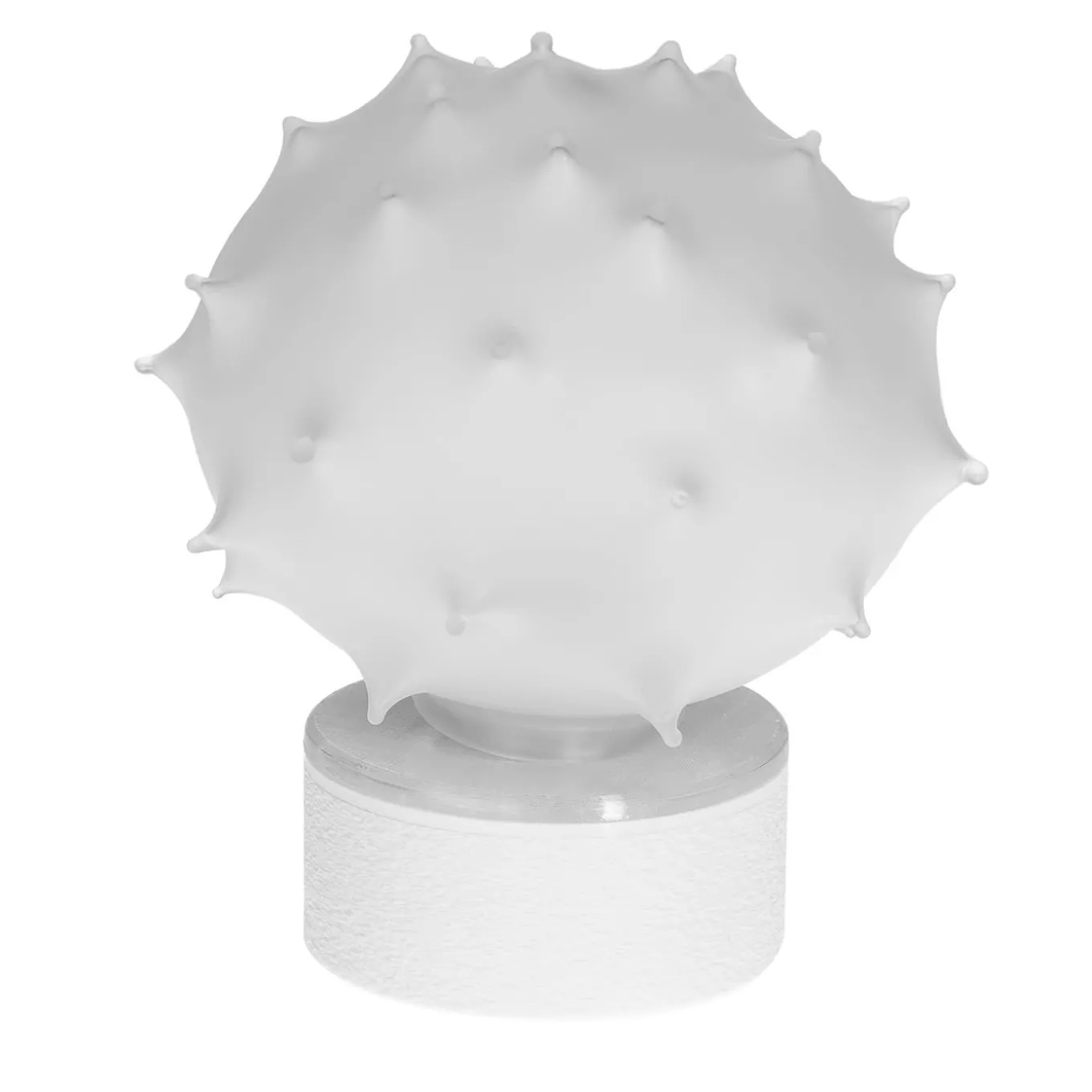 Trilli Riccio è una lampada da tavolo a LED senza fili realizzata artigianalmente e caratterizzata da una sfera di vetro soffiato a mano con punte meticolosamente disegnate, poi sabbiate per ottenere una texture unica. Disegnata da Catherine Urban, questa lampada offre tre modalità di luce: fissa, effetto candela e spenta, con una durata della batteria di 5 ore. Disponibile in due dimensioni, unisce l’arte del vetro veneziano alla tecnologia moderna. Realizzata a mano a Venezia. Base inclusa.