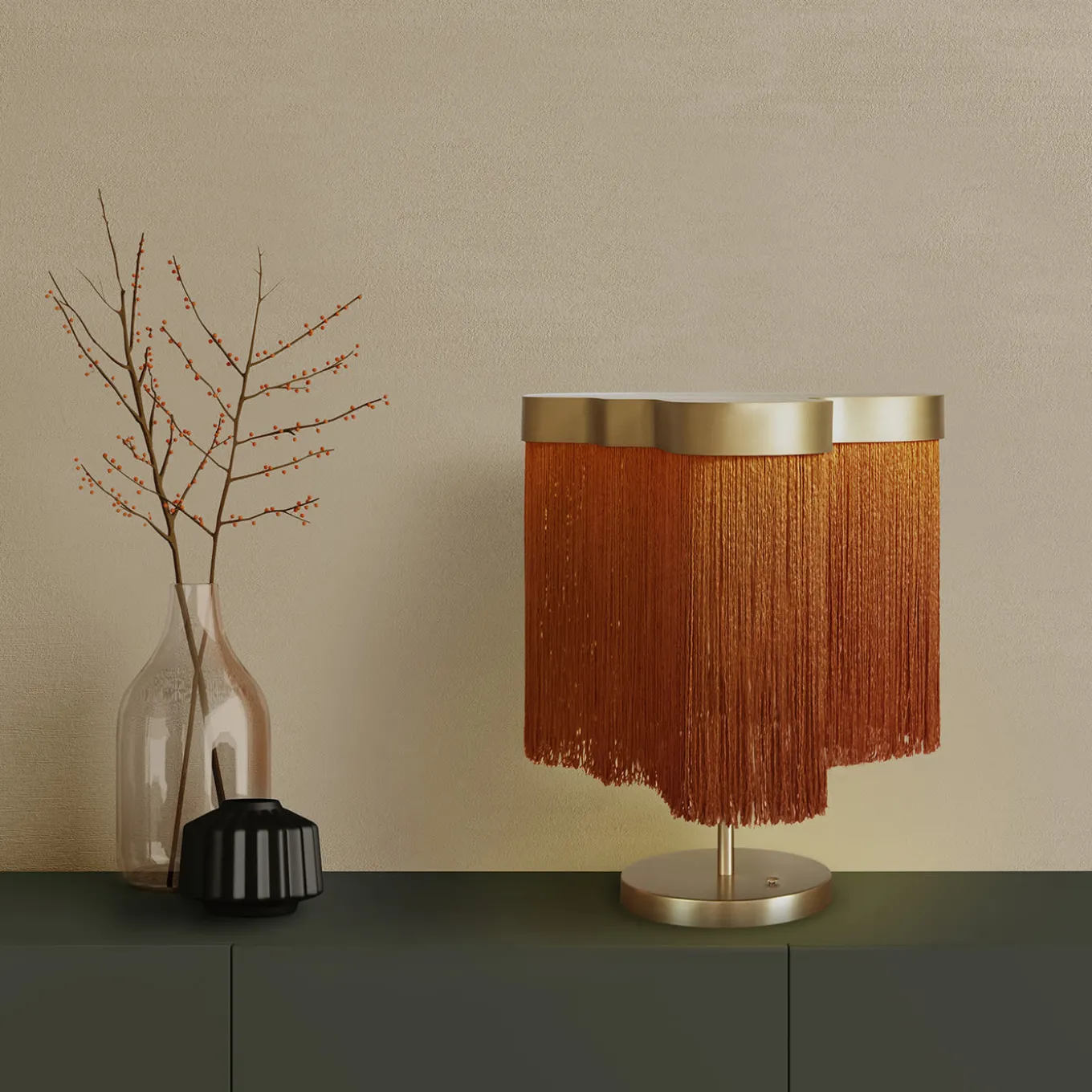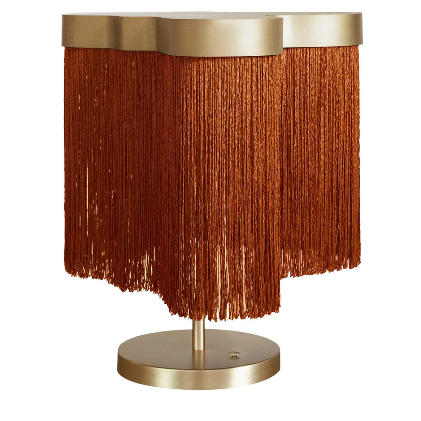 Questa lampada da tavolo, dal design straordinariamente glamour con frange, è una soluzione intelligente per accentuare gli ambienti contemporanei con un pizzico di allure fantasiosa. Le frange color ruggine – che scendono da un elemento superiore sinuoso i cui contorni irregolari sono giocosamente ispirati agli arcipelaghi – filtrano la luce in un bagliore soffuso che contribuisce a valorizzare la delicata finitura in ottone satinato della struttura.