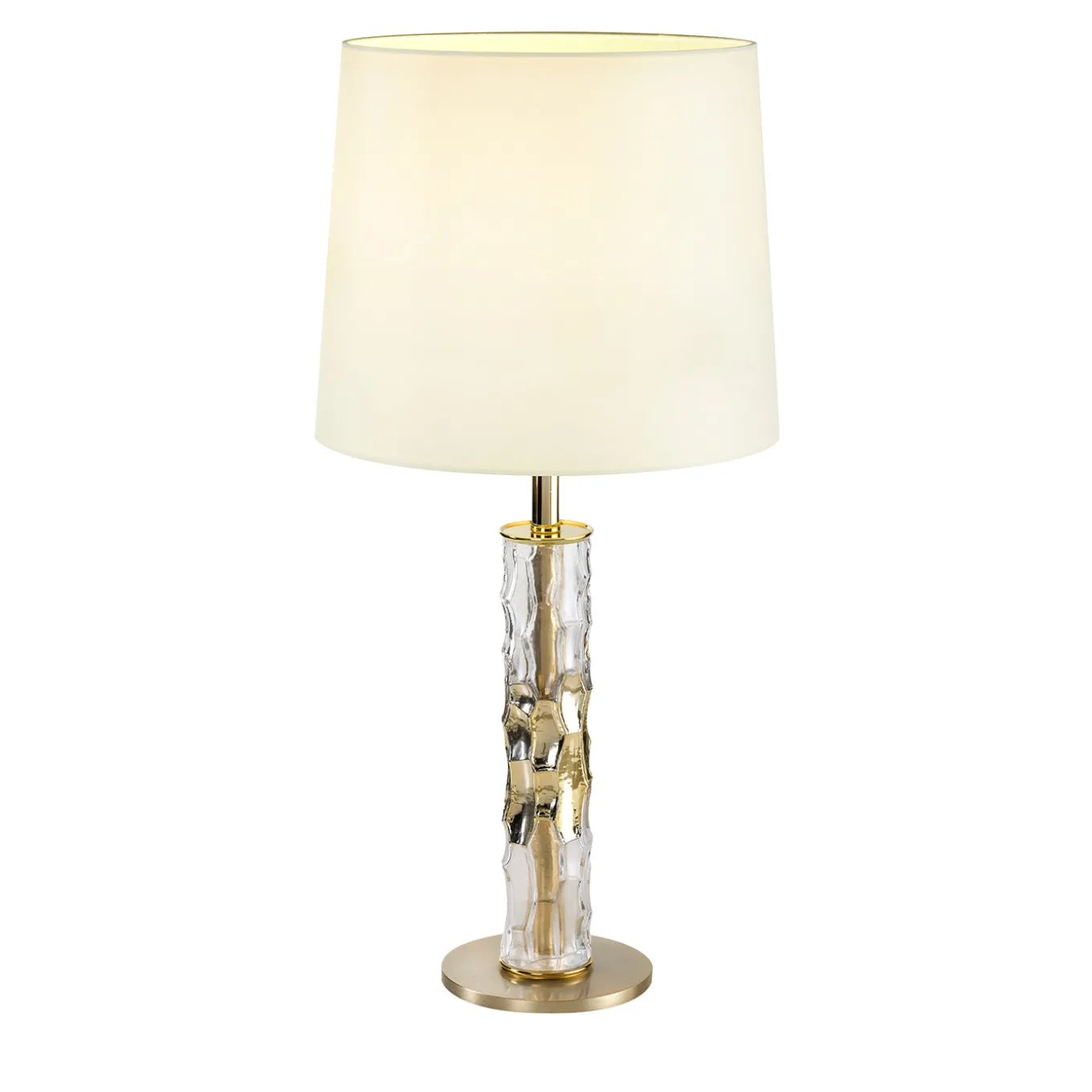 Questa lampada da tavolo di dimensioni medie presenta una base finita in oro satinato 24 carati con una colonna in vetro trasparente testurizzato, accentuata da una banda metallica dorata. Sorretta da un paralume in chinette avorio che diffonde delicatamente la luce, combina motivi naturali con raffinate dettagli metallici per valorizzare qualsiasi scrivania o comodino. Lampadina non inclusa.