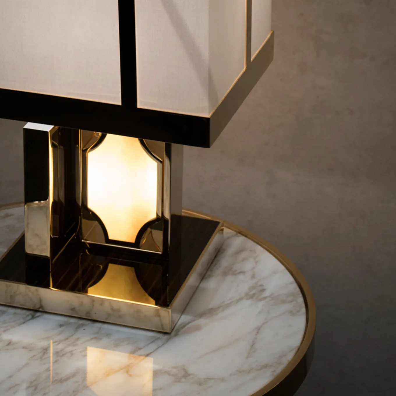 Una combinazione intricata di materiali raffinati, questa lampada accattivante fornirà un’illuminazione attraente in qualsiasi stanza. La base unica è incorniciata in metallo placcato oro ed è creata da due elementi rettangolari disposti a T sopra un quadrato in ebano laccato. L’elemento centrale in Onice miele translucido con venature giallo-pesca ha un design esagonale ed è retroilluminato per creare un’atmosfera calda e un’opulenta attrattiva visiva. L’altro elemento laterale è in ebano laccato. Il grande paralume bianco è accentuato da un bordo in oro lucido e bande decentrate. La bulb E27 non è inclusa.