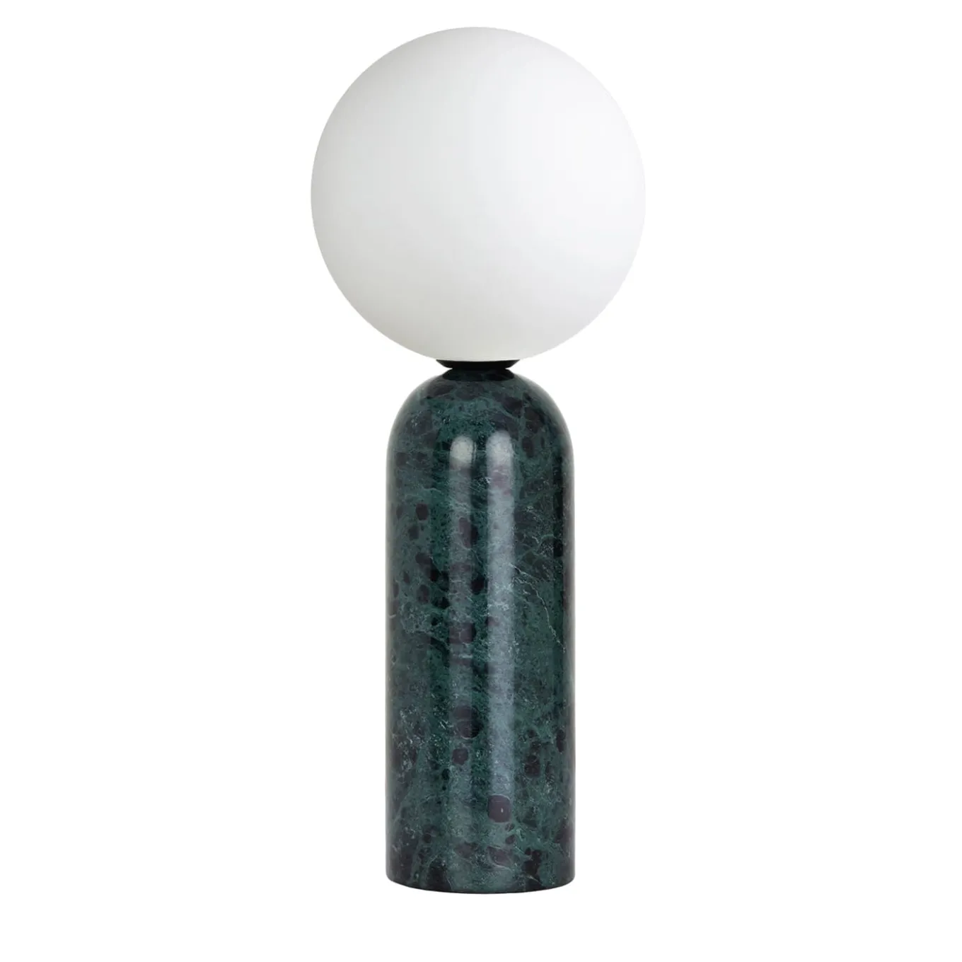 Questa splendida lampada da tavolo è caratterizzata da un magnifico corpo in marmo verde Guatemala di alta qualità, dalla forma cilindrica con la parte superiore curva. Questo affascinante design contemporaneo è completato da un vetro opalino bianco sferico di 16 cm di diametro. Nel catalogo Artemest è disponibile anche una versione in marmo bianco Calacatta.