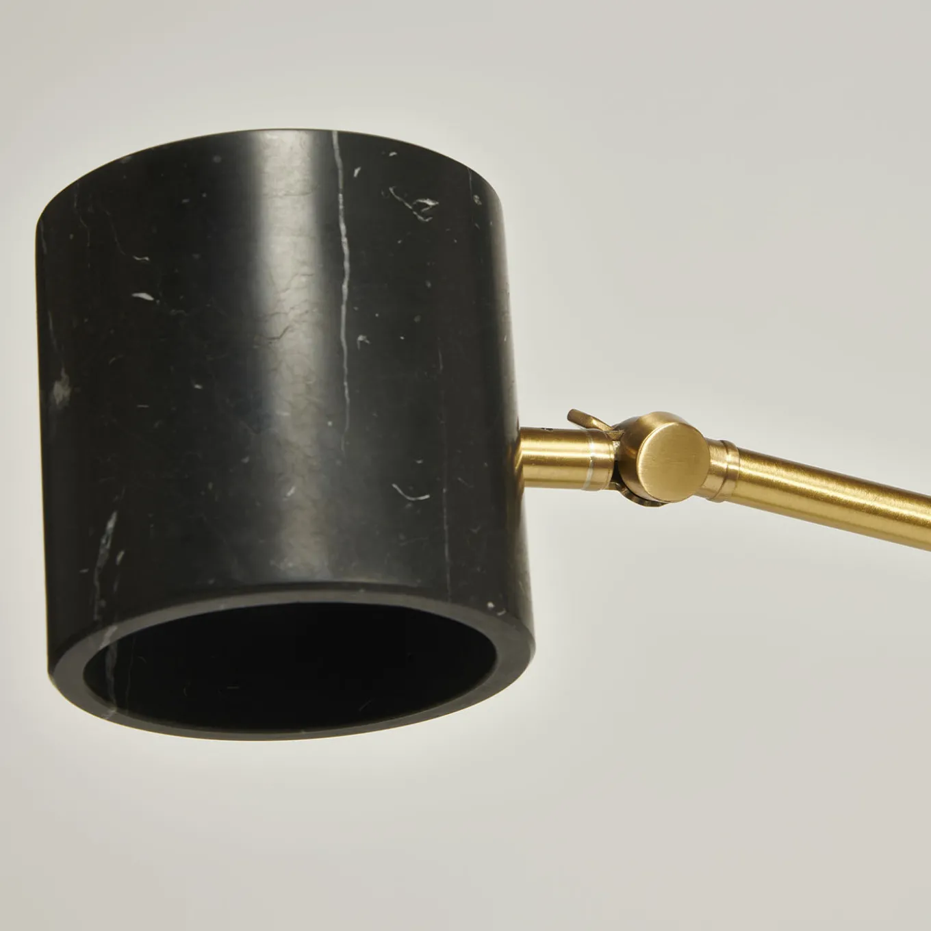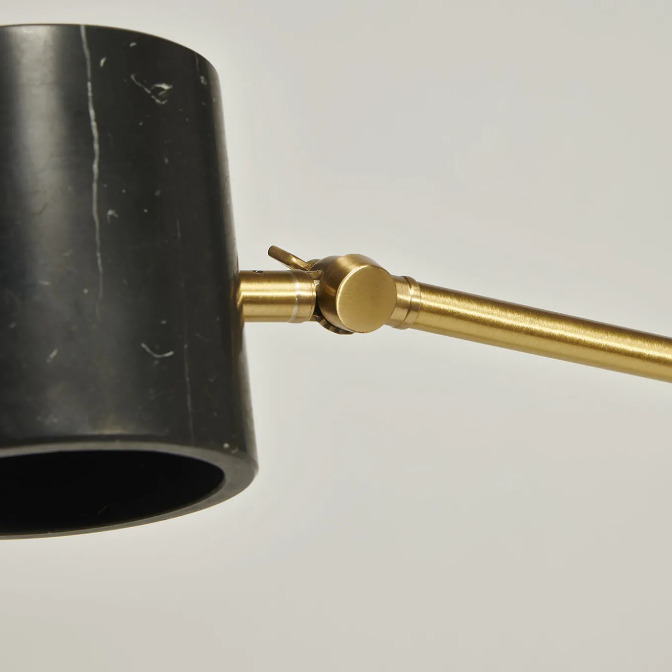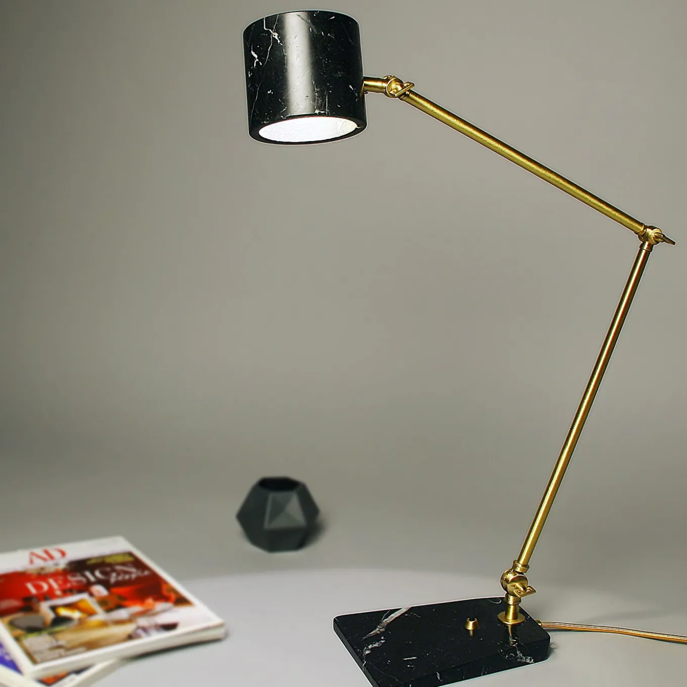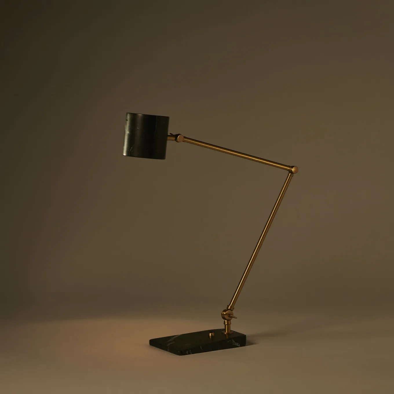 La lampada da tavolo Flamingo è caratterizzata dal contrasto tra i volumi dei suoi elementi: la sottigliezza dello stelo angolare regolabile in ottone contrasta con l’insolito paralume regolabile in marmo.