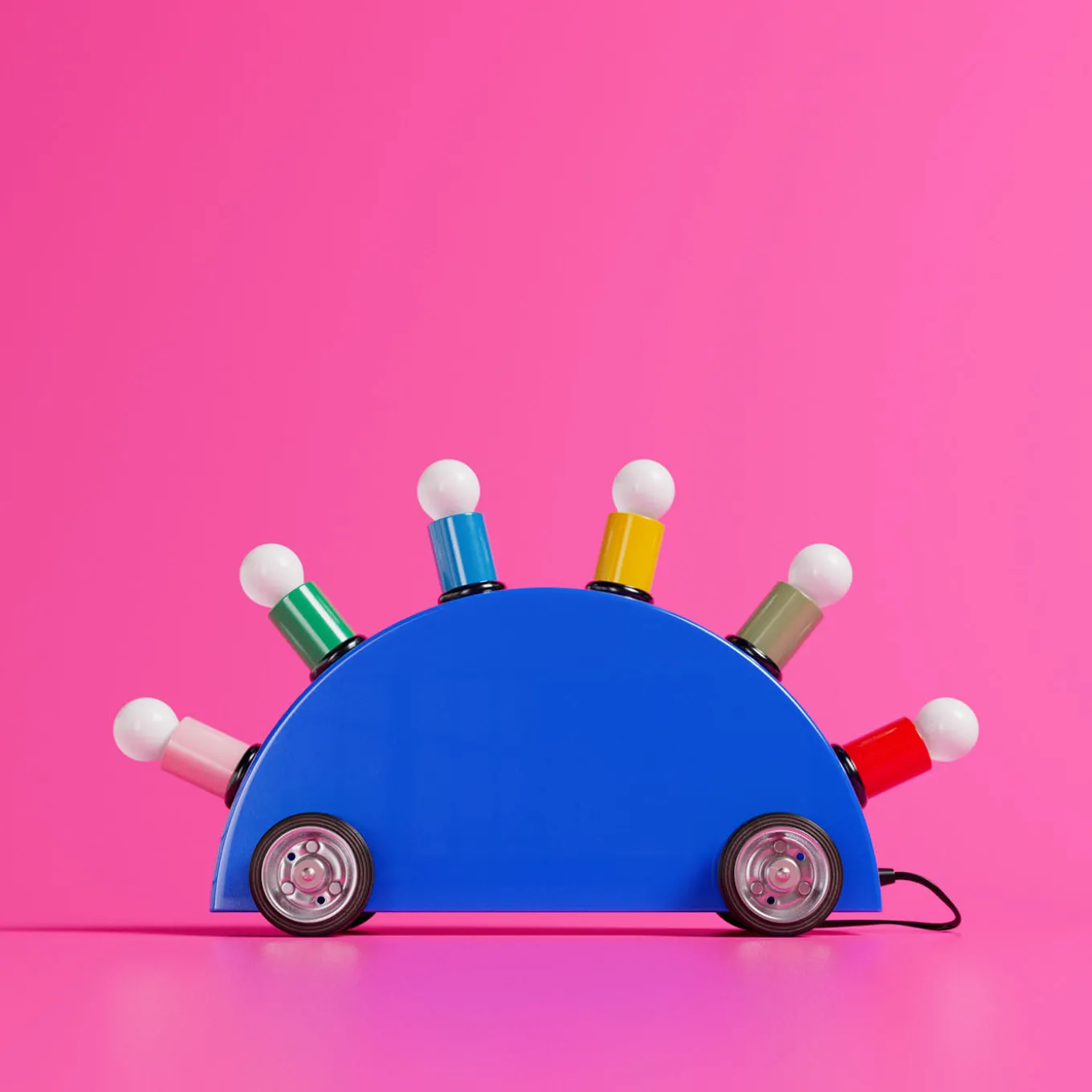 Con la forma giocosa di un’automobile stilizzata, questa lampada da tavolo è stata disegnata nel 1981 da Martine Bedin. Realizzata in fibra di vetro, presenta due ruote alla base della sua silhouette semicircolare blu, mentre i bordi sono ornati da sei portalampada nei colori rosa, verde, blu, giallo e rosso. Splendido complemento per la camera dei bambini o per uno studio eclettico, questo pezzo può essere dotato di un sistema a 100V contattando il Concierge prima di effettuare l’ordine.