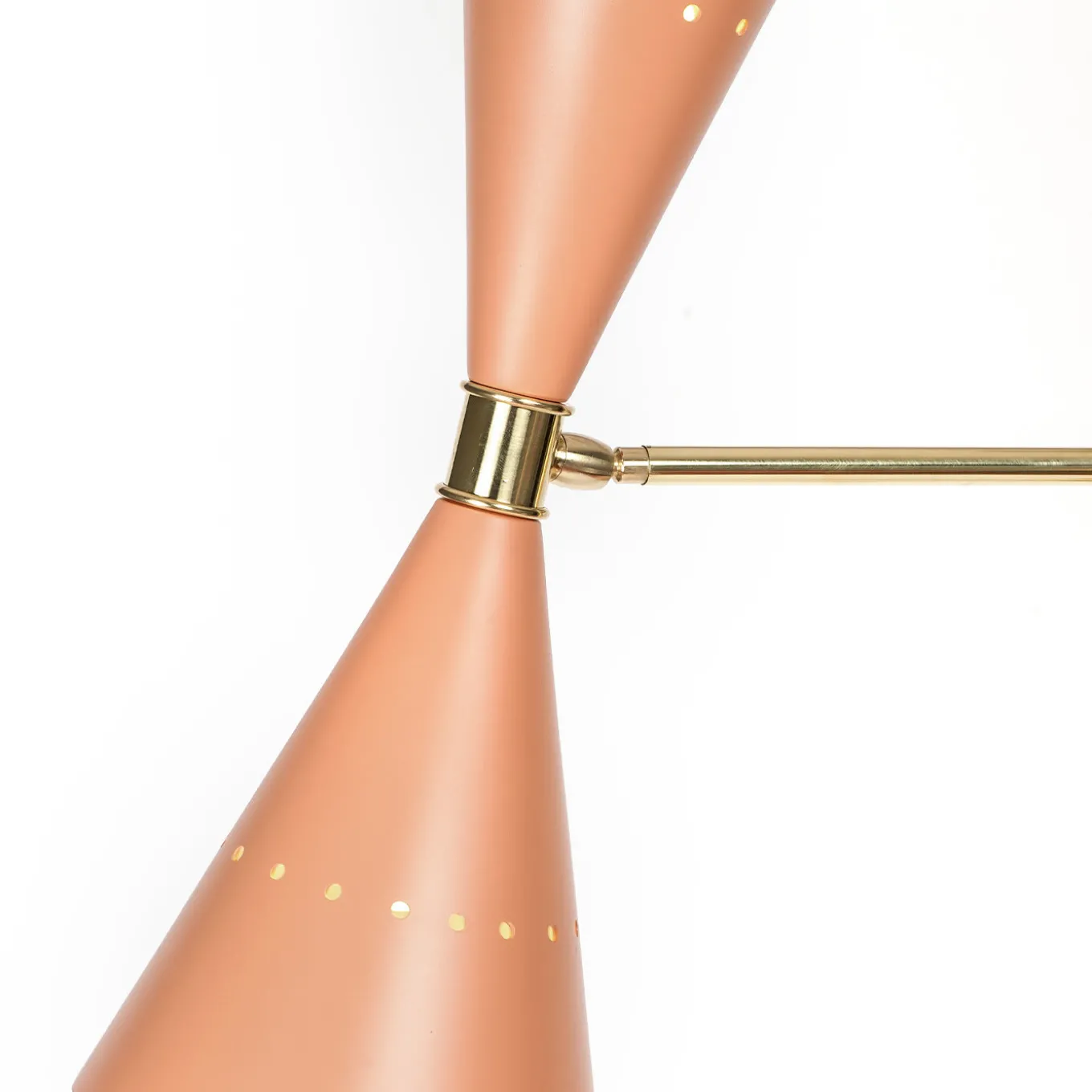Ispirata allo stile iconico e senza tempo dello Stilnovo, questa lampada da terra si adatta facilmente a qualsiasi ambiente della casa, vantando una silhouette unica e versatile dal fascino minimalista. Interamente realizzata in ottone, è composta da un lungo stelo montato su una base a treppiede che sostiene due bracci, ognuno dei quali è dotato di un paralume a doppio cono caratterizzato da una tonalità rosa pesca. I bracci e i paralumi possono essere spostati in diverse direzioni per orientare l’illuminazione a piacimento. Questa lampada da terra è disponibile per la personalizzazione in altri colori, chiedere al Concierge per i dettagli.