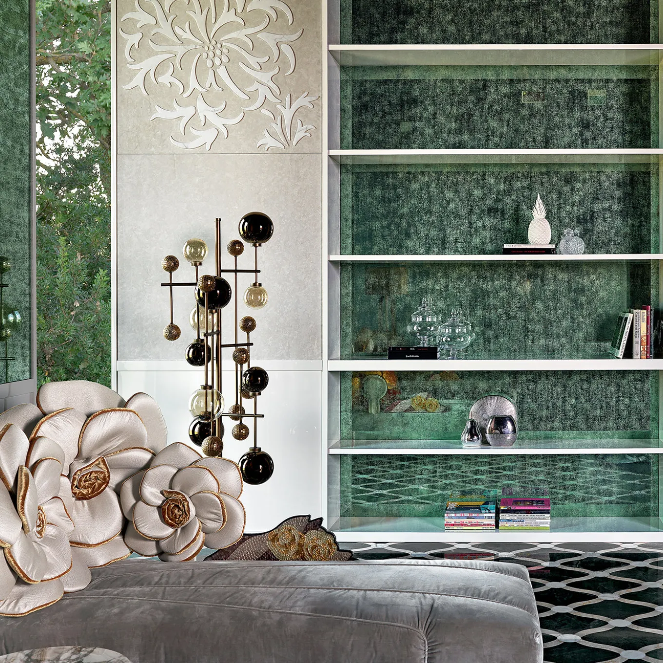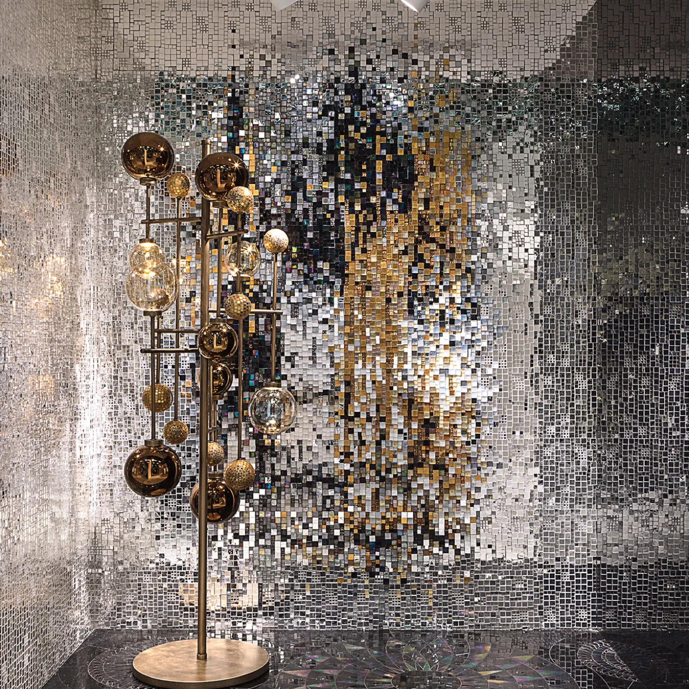 La lampada da terra Fluxus, di ispirazione atomica, è uno stile di grande impatto per gli spazi contemporanei, con sfere di vetro ricoperte da scintillanti finiture color ambra, bronzo e cromo. Ad aumentare il fascino della lampada sono le piccole sfere con sottili accenti a mosaico che scintillano quando vengono illuminate. La lampada può essere personalizzata con finiture in oro o nichel spazzolato.