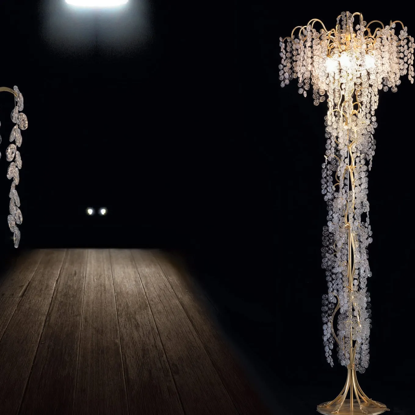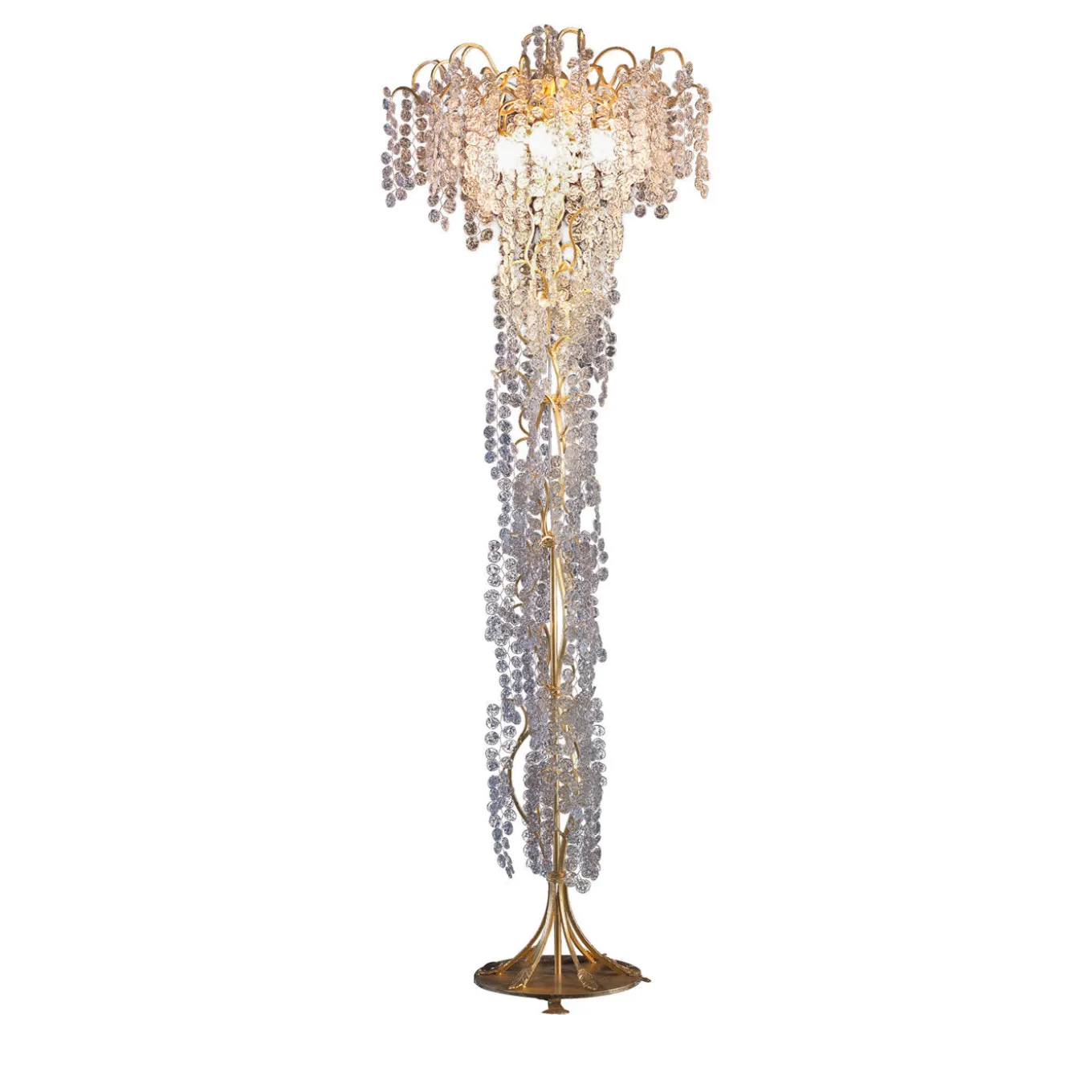 La silhouette opulenta di questa squisita lampada da terra si erge da una base circolare in una ramificazione verticale di elementi metallici curvi decorati con foglie, tutti arricchiti con foglia d’oro. Le sei lampadine ES (G9 max 33W ciascuna) proiettano una luce calda dalla parte superiore della lampada, con due luci LED (GU10 ad 8W) posizionate sotto. La cascata di petali di vetro legati a mano che pendono dal telaio metallico distingue il carattere di questa ipnotizzante lampada da terra. Dimmerabile su richiesta.