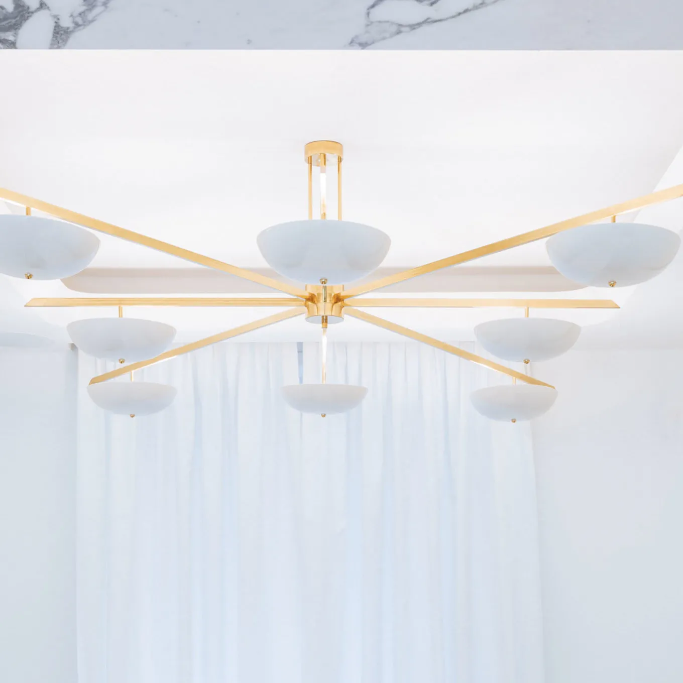 La struttura simmetrica e geometrica in alluminio di questo lampadario di grande effetto è impreziosita da una finitura oro spazzolato che esalta la forma semicircolare dei paralumi bianchi. Sospeso al soffitto per mezzo di un’asta cilindrica, questo pezzo presenta otto lunghi bracci che si estendono dal centro in un’accattivante forma a stella. Progettato per illuminare grandi spazi, questo pezzo sofisticato infonderà un fascino artistico a una spaziosa zona pranzo o a una camera da letto.