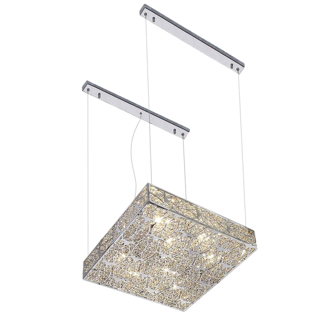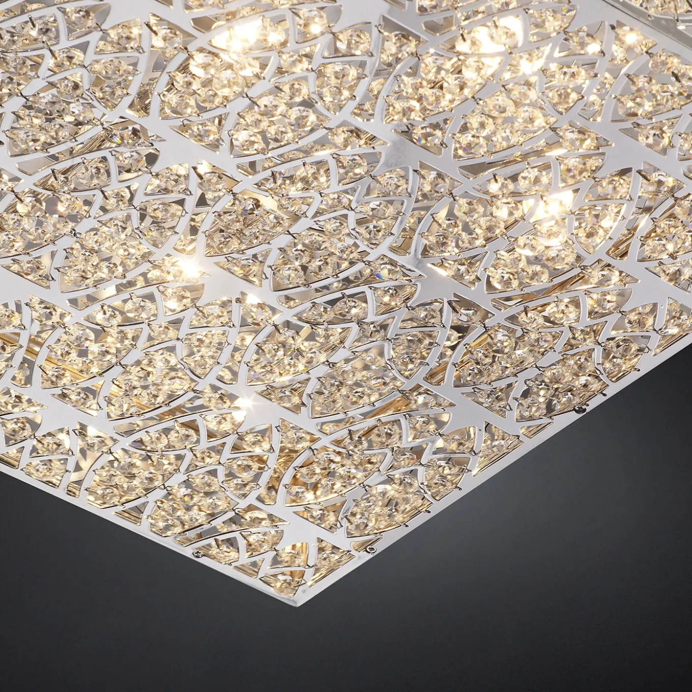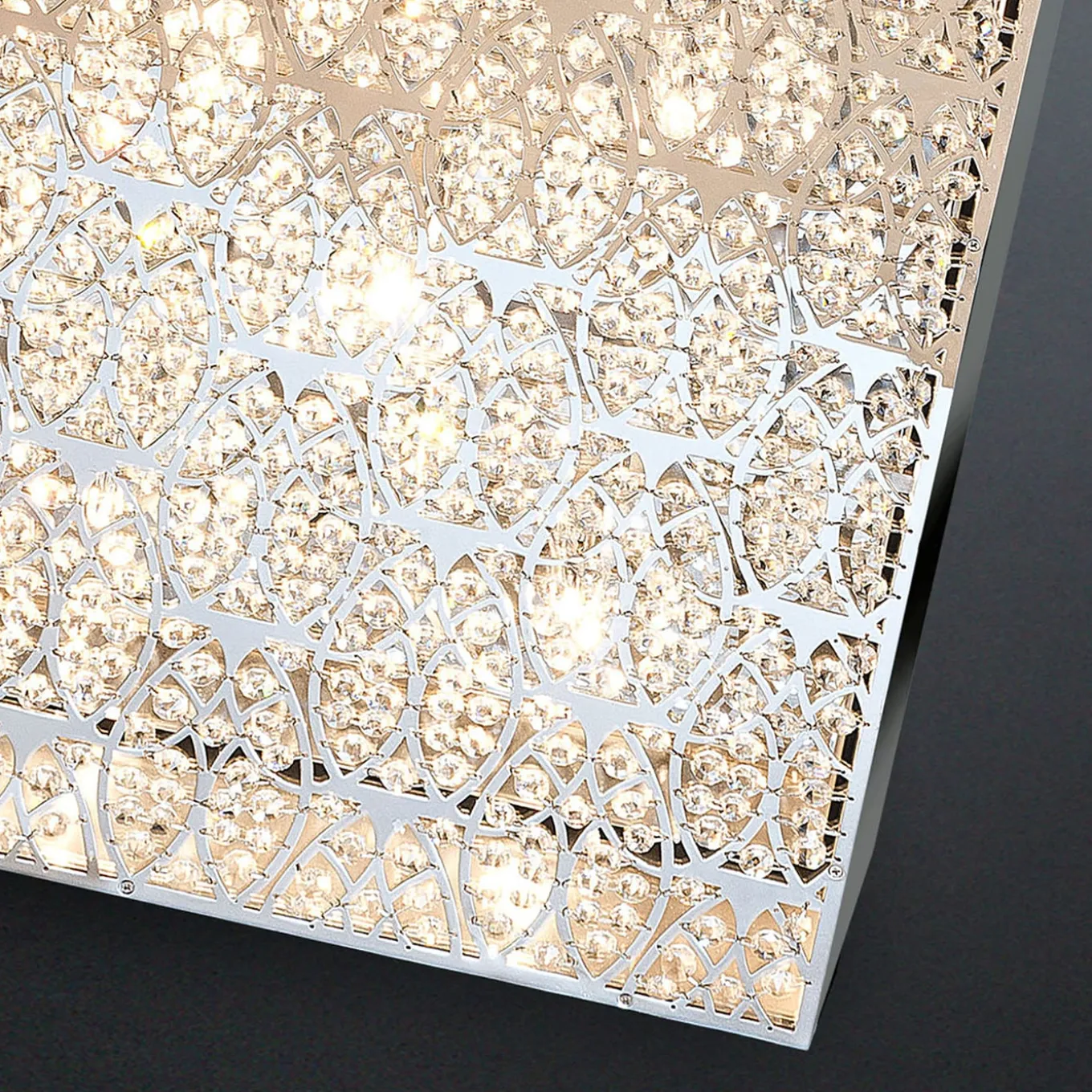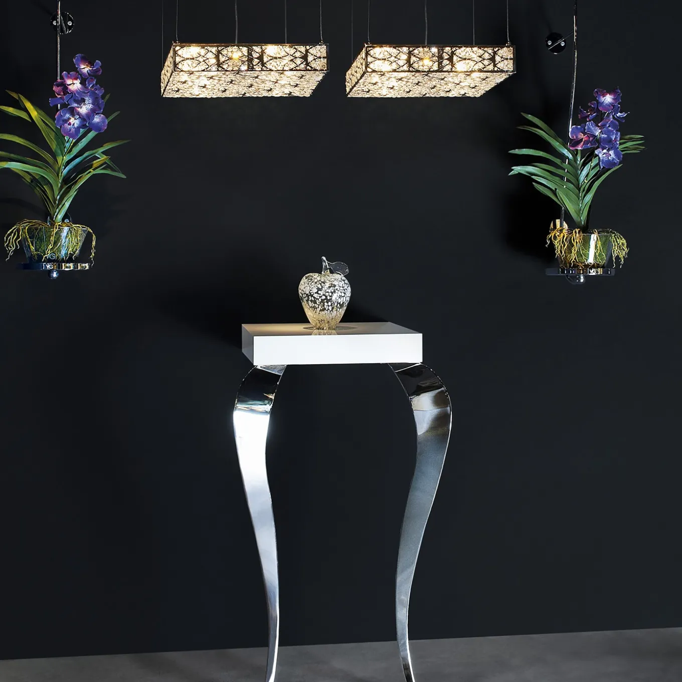 Maglie in acciaio cromato accuratamente saldate tra loro e modellate per ricreare un seducente motivo arabesco traforato contraddistinguono questo prezioso lampadario. L’ispirazione geometrica si rivela al primo sguardo, in netto ma armonioso contrasto con i cristalli che arricchiscono il pezzo, tutti minuziosamente applicati a mano. Pendente da cavi sottilissimi, il design si adatta a lampadine LED G9.