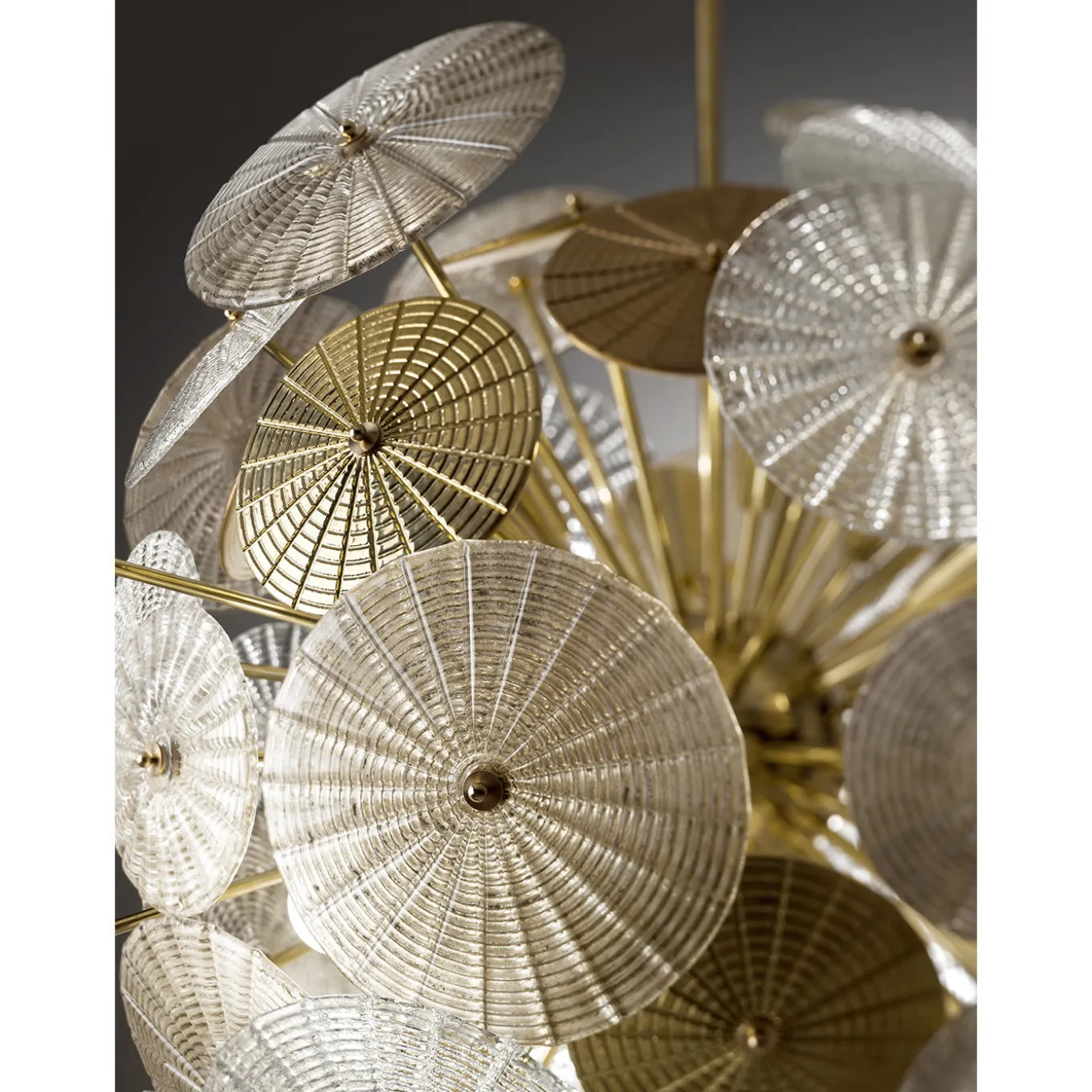Traducendo magistralmente in un design contemporaneo la delicata silhouette di un dente di leone, questo lampadario è un superbo oggetto di arredamento funzionale. È dotato di 16 luci e di una forma sferica che combina una struttura in ottone con diffusori in porcellana e vetro di Murano soffiato a bocca, per un effetto unico di ineguagliabile raffinatezza.