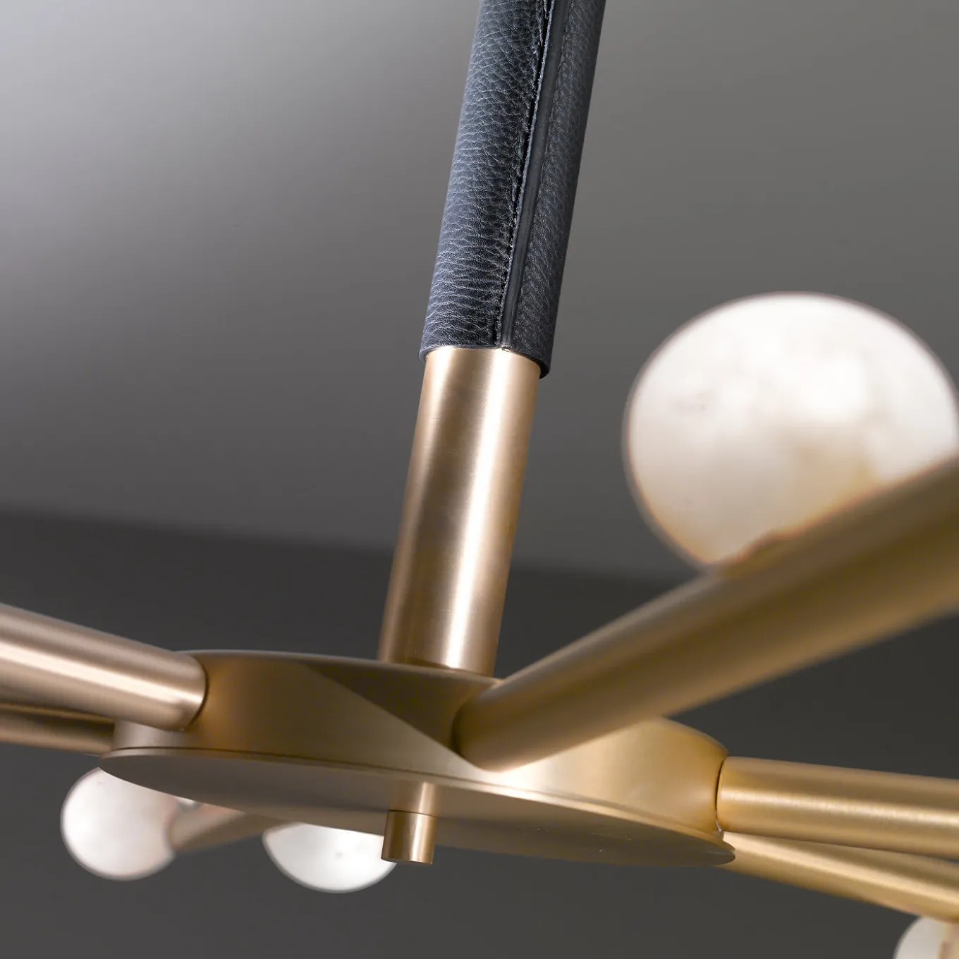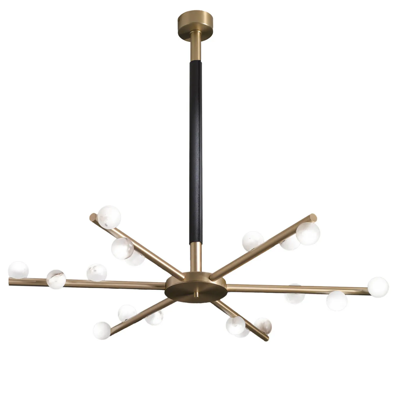 Omaggio alla dea greca Demetra e alla sua simbolica fiaccola, questo stupendo lampadario infonderà un fascino etereo in un interno contemporaneo o minimalista. Montato su una struttura metallica parzialmente rivestita in pregiata pelle nera cucita a mano, presenta sei bracci completati ciascuno da tre affascinanti paralumi sferici in alabastro bianco. Ogni paralume supporta una lampadina LED (3000K – 126W – 200mA).