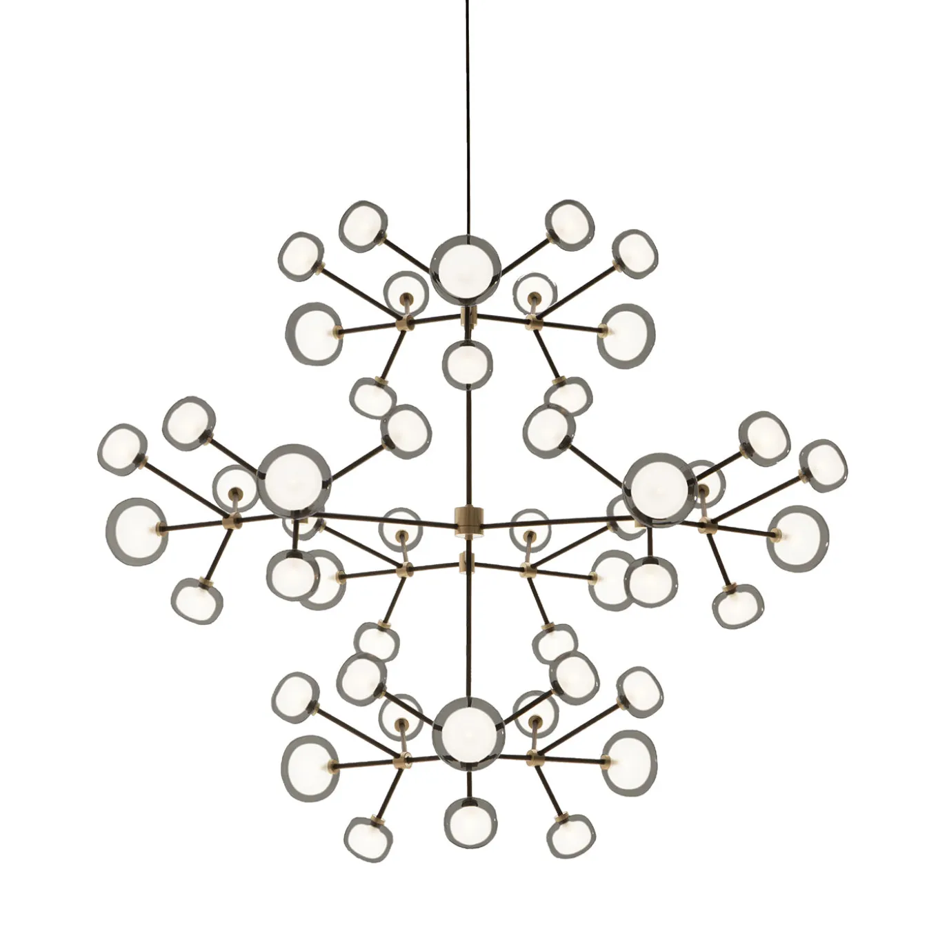Imponente lampadario geometrico con una struttura elaborata in nero opaco, valorizzata da dettagli in ottone spazzolato. Composto da quarantotto globi sferici in vetro borosilicato a doppia emissione, emette una luce soffusa e avvolgente che valorizza gli ampi interni contemporanei. Disegnato da Corrado Dotti, questo pezzo crea un forte impatto visivo, fungendo da elemento centrale audace e raffinato in ambienti moderni.