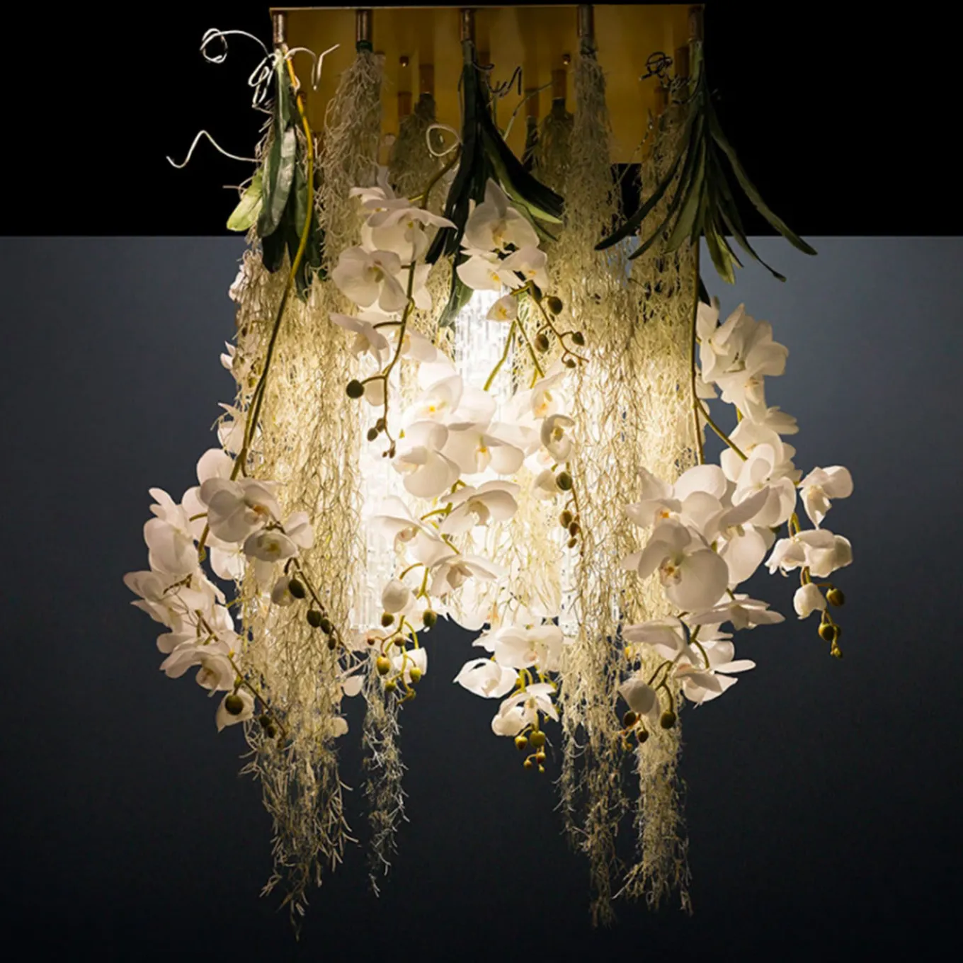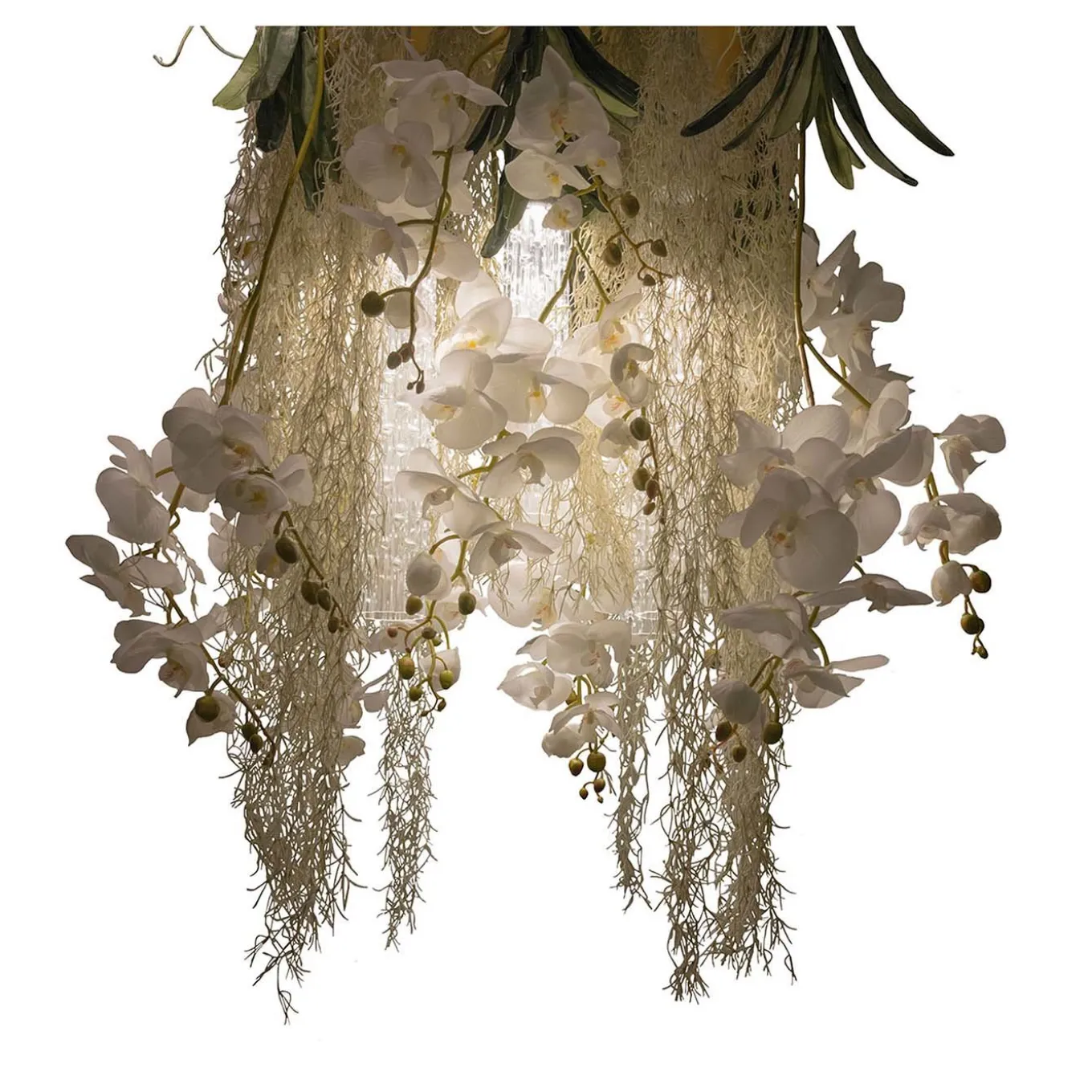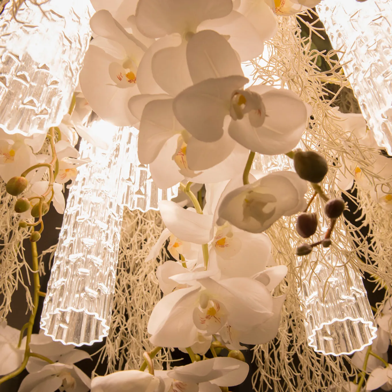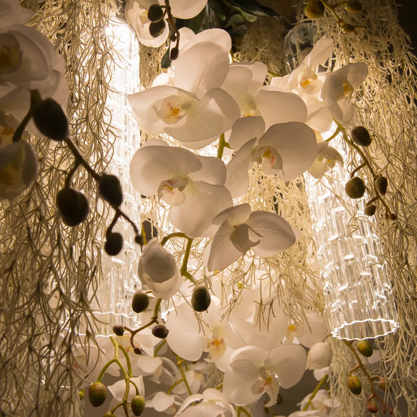 Questo spettacolare design fa parte della collezione Flower Power, che unisce dramma e natura in lampadari unici di forte impatto visivo. Questo pezzo è costituito da una piastra metallica che può essere incassata nel soffitto o montata a filo. Un paesaggio capovolto di finte orchidee scende dalla base e racchiude gli eleganti cilindri in vetro di Murano soffiato a bocca. Le luci LED si riflettono sulla superficie per illuminare la composizione floreale per un effetto sublime che non passerà inosservato. Certificazioni contrattuali e commerciali disponibili su richiesta.