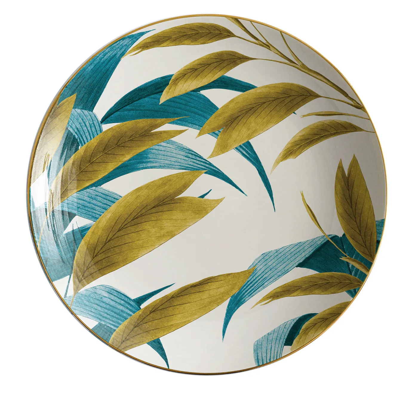 Questo splendido piatto fa parte della serie di piatti in porcellana Las Palmas della Grand Tour Collection di Vito Nesta, ispirata ai viaggi dell’artista in tutto il mondo. Realizzato a mano in porcellana, il pezzo presenta uno squisito dipinto di fogliame che evoca il paesaggio della foresta pluviale amazzonica vicino alla città di Palmas in Brasile.