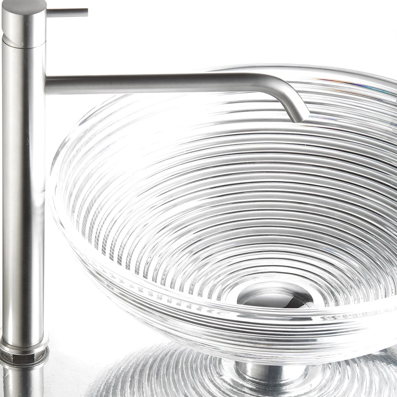 Lavandino artigianale italiano in cristallo trasparente con dettagli scanalati a mano. Caratteristiche funzionali che creano un bagno di eccezionale eleganza, calore e valore.