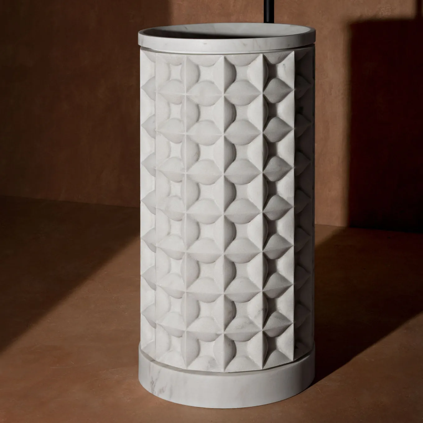 Il lavabo in marmo cilindrico freestanding ‘Dawn’ di Christophe Pillet presenta un blocco cilindrico scultoreo arricchito da una texture ornamentale a griglia tridimensionale sulla sua superficie esterna. Questo design è incorniciato da due bande lisce e lucide alla base e alla sommità, evidenziando il contrasto tra finiture testurizzate e raffinate. Il lavabo funge da elegante pezzo monolitico centrale, ispirandosi alla ricca tradizione del marmo italiano. Rubinetti non inclusi.