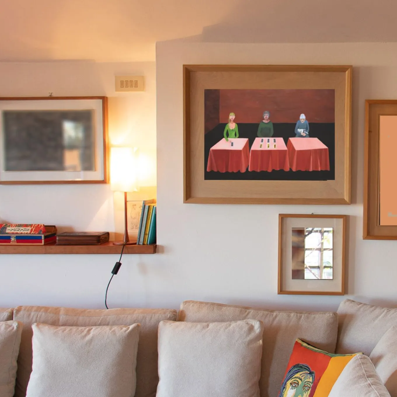 Questo superbo dipinto offre un percorso metaforico attraverso la vita e le sue fasi. Sedute a un tavolo coperto da una tovaglia rossa, tre donne scoprono attraverso le carte ciò che la vita ha o aveva in serbo per loro. La giovane donna appare sorpresa ed emozionata, la signora di mezza età contempla ricordi e rimpianti, mentre l’anziana signora tiene in mano l’ultima carta, guardandola con sospetto. La cornice non è inclusa.
