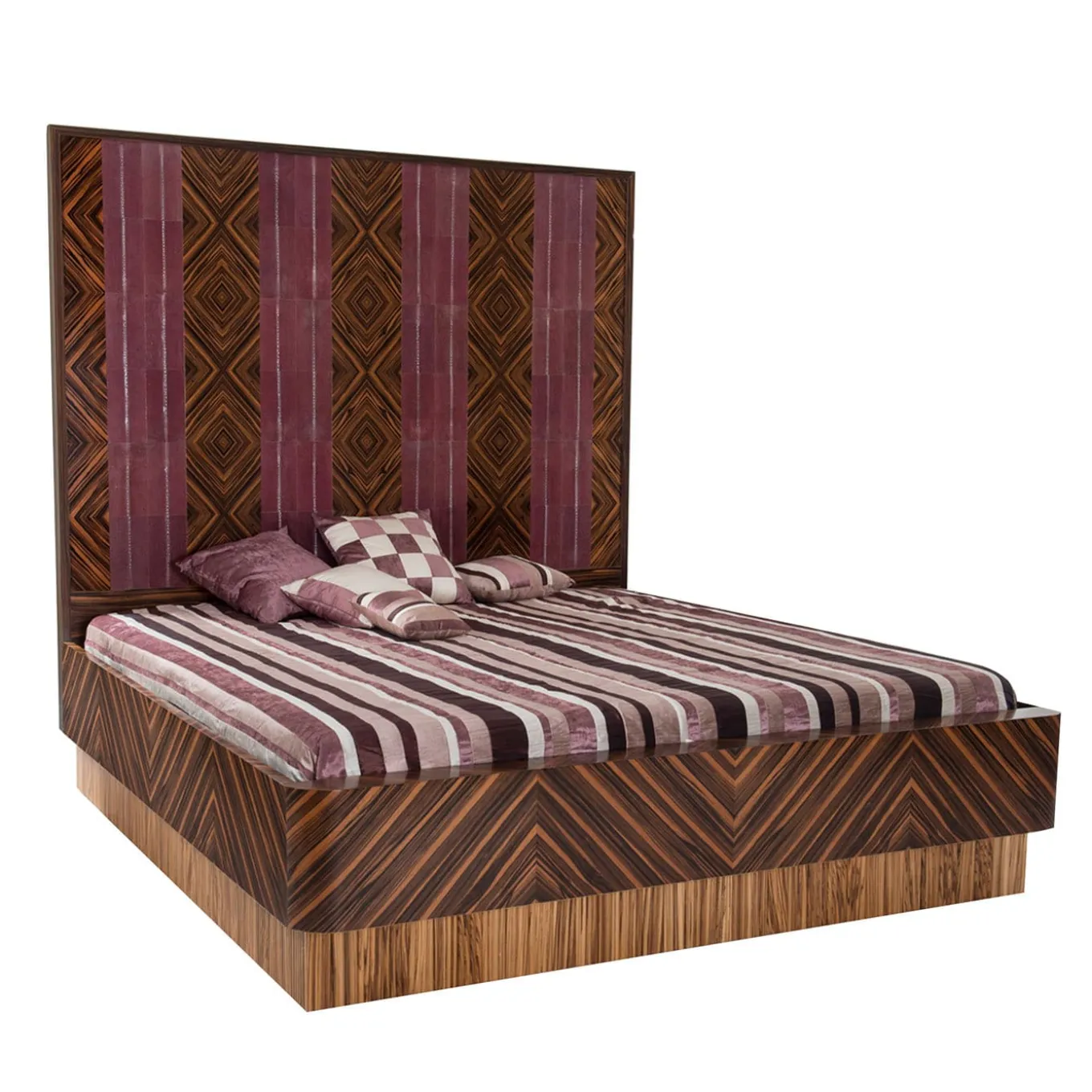 Questo magnifico letto king-size si distingue per la notevole struttura in ebano Makassar intagliato in un suggestivo motivo angolare arricchito da inserti in galouchat rosso vino. Poggiato su un’elegante base in legno di zebra, non include materasso e cuscini. Per ulteriori informazioni, rivolgersi al Concierge.
