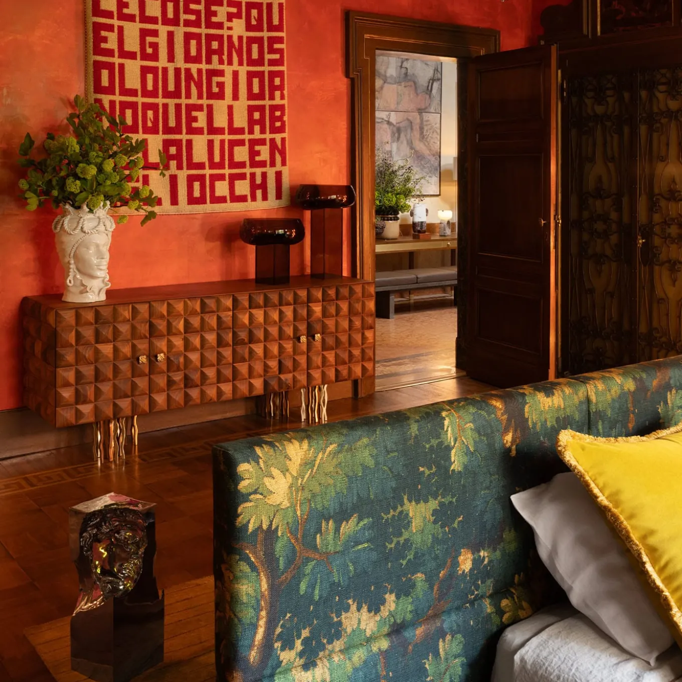 Il letto “Senza fine” ha una struttura composta da una scocca in legno imbottita con poliuretano espanso e rifinita con un sottile strato superiore di fibra acrilica. La testata e il giroletto poggiano su una base in legno nero opaco che può essere rivestita con un rivestimento in metallo color ottone spazzolato. Il letto viene fornito con una rete a doghe di legno. Per ulteriori informazioni, contattare il servizio di Concierge.