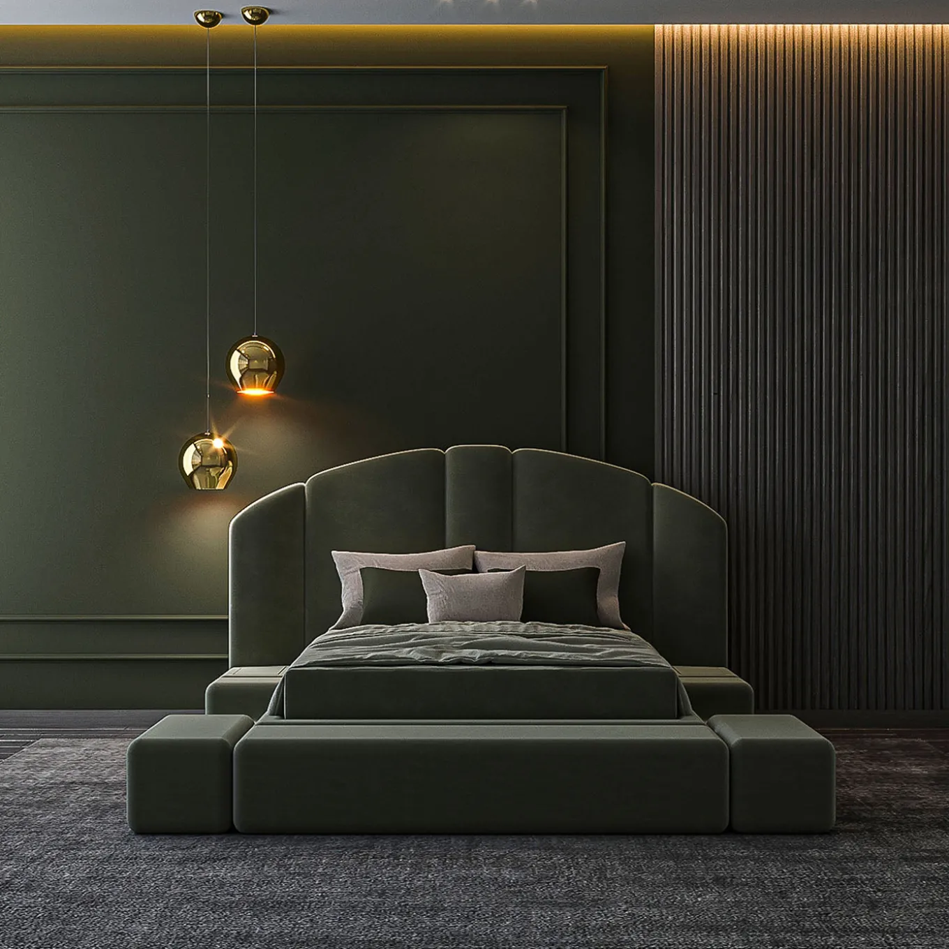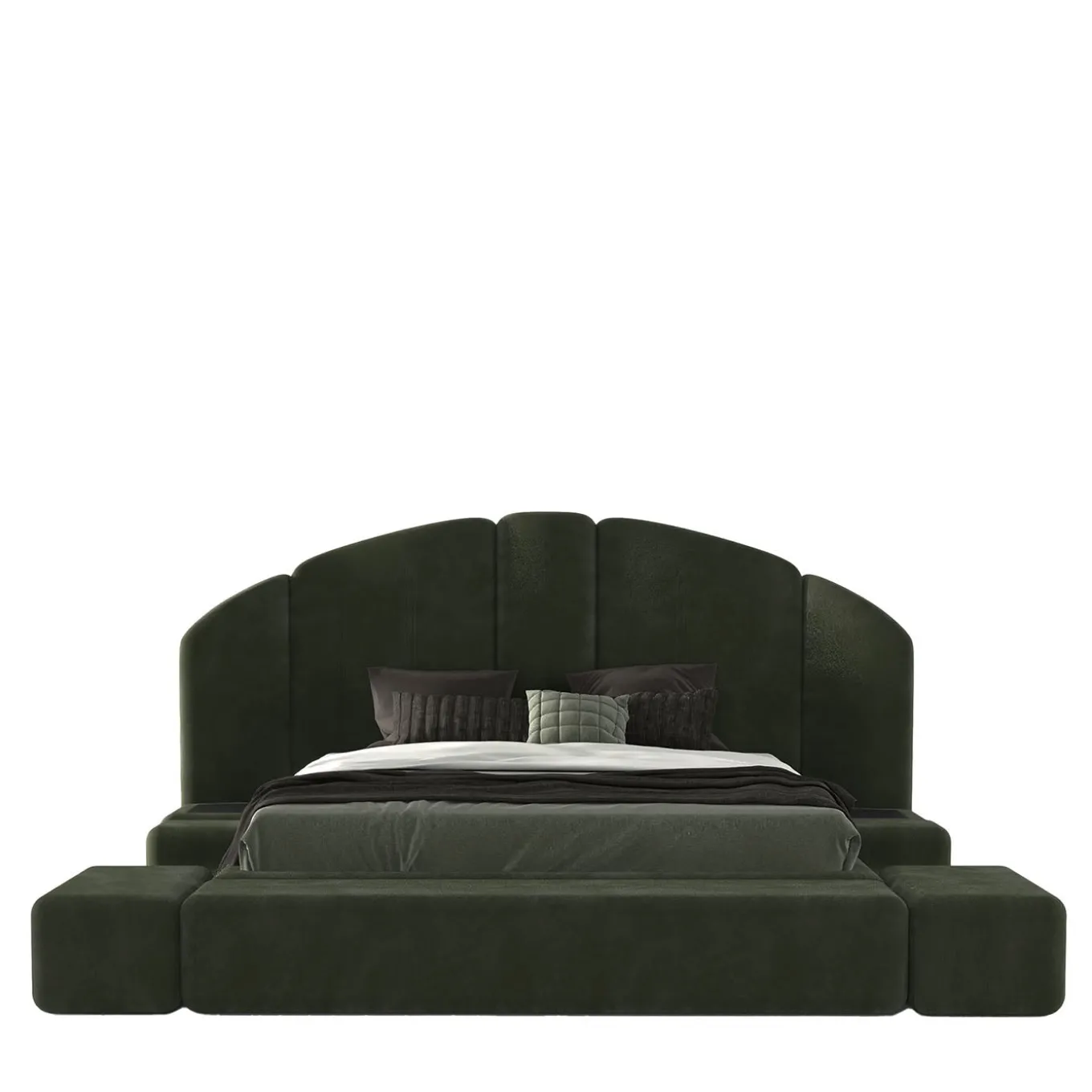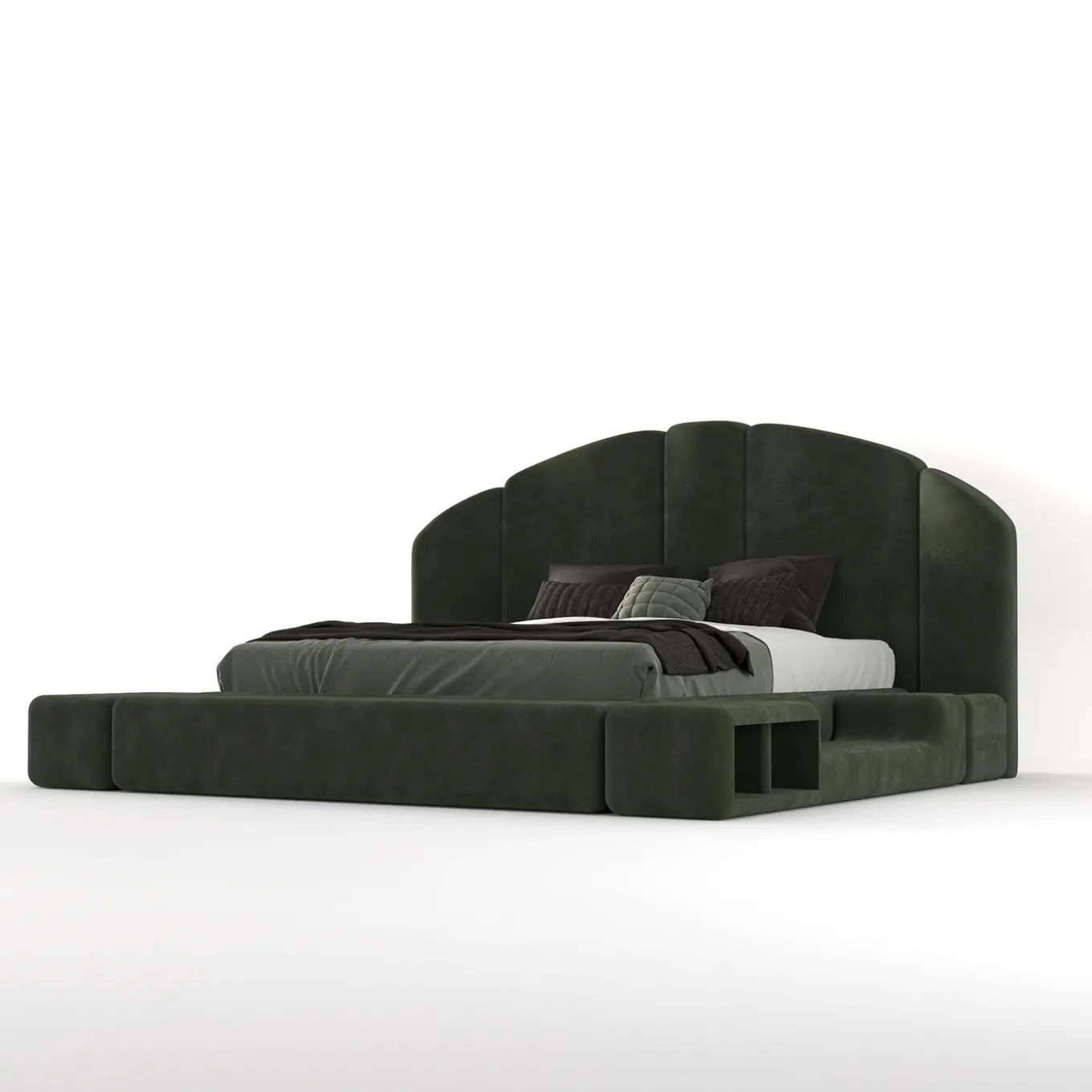 Il Concept 01 è un letto imbottito modulare caratterizzato dalla sua versatilità e dal design personalizzabile, che consente una varietà di composizioni raffinate e accoglienti. La struttura presenta panche frontali e laterali, disponibili con o senza gradini, e un telaio imbottito in schiuma di poliuretano a densità differenziata. Include piedi interni invisibili alti 3 cm e supporti angolari in metallo per installare il telaio del materasso senza piedi. La copertura del telaio del letto rimovibile è rifinita in tessuto verde muschio idrorepellente. Disponibile anche in altre finiture, contattare il Concierge per maggiori informazioni.