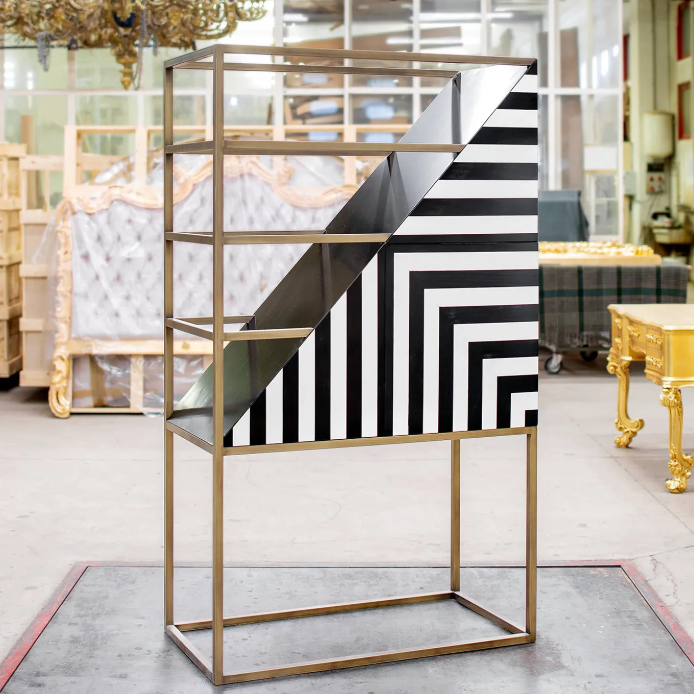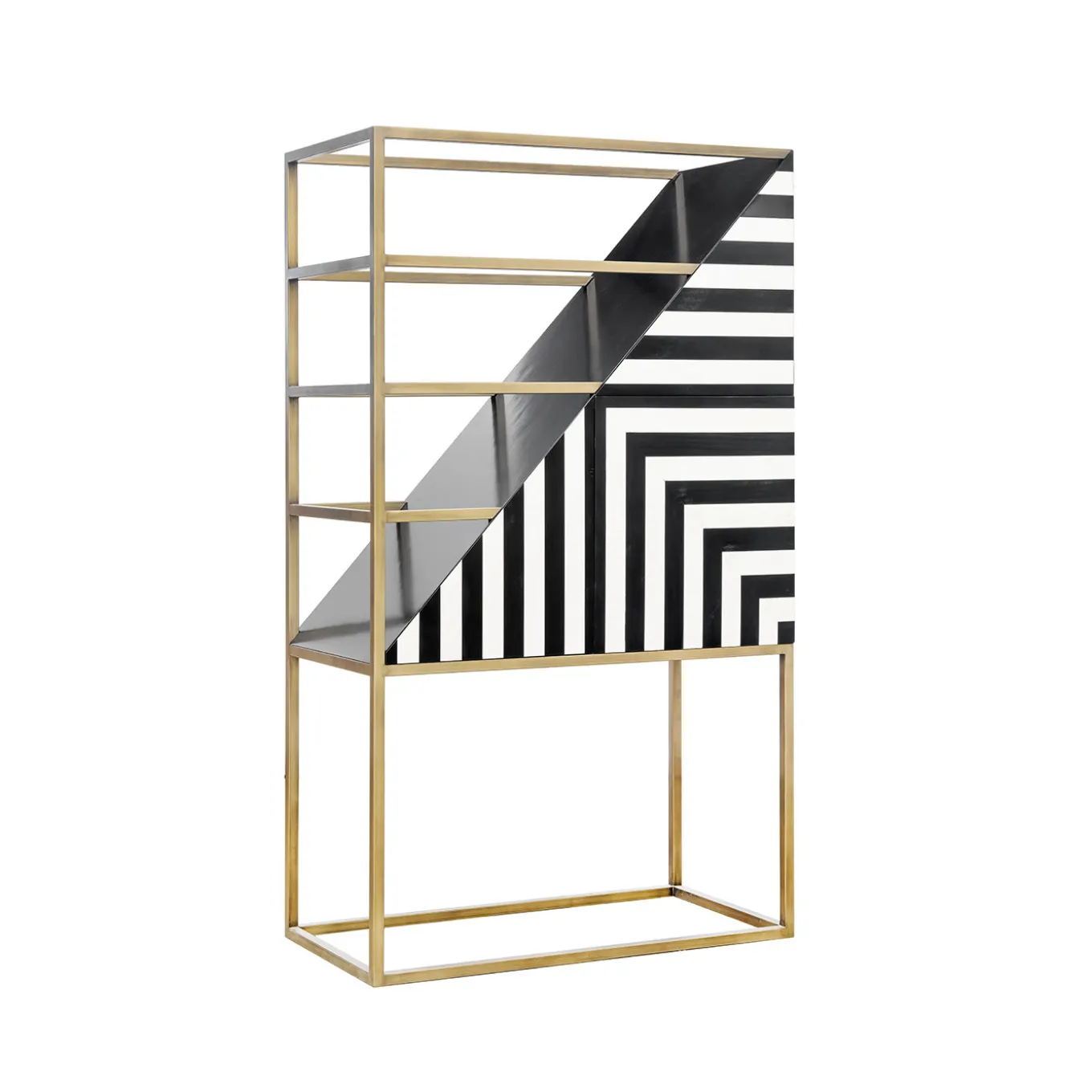 Questa singolare libreria, che fonde design e funzionalità, ha un design bifacciale che le permette di essere utilizzata come divisorio indipendente in interni in stile loft o di essere collocata contro una parete spoglia come punto focale artistico. Un esercizio di geometria visiva, questa libreria comprende elementi aperti e chiusi. Caratterizzata da ripiani in cristallo, la sottile struttura metallica è rifinita in ottone spazzolato per creare un contrasto cromatico con l’intarsio a spina di pesce realizzato a mano in legno di pero bianco e nero che orna i sei pannelli delle ante. Personalizzazione disponibile su richiesta.
