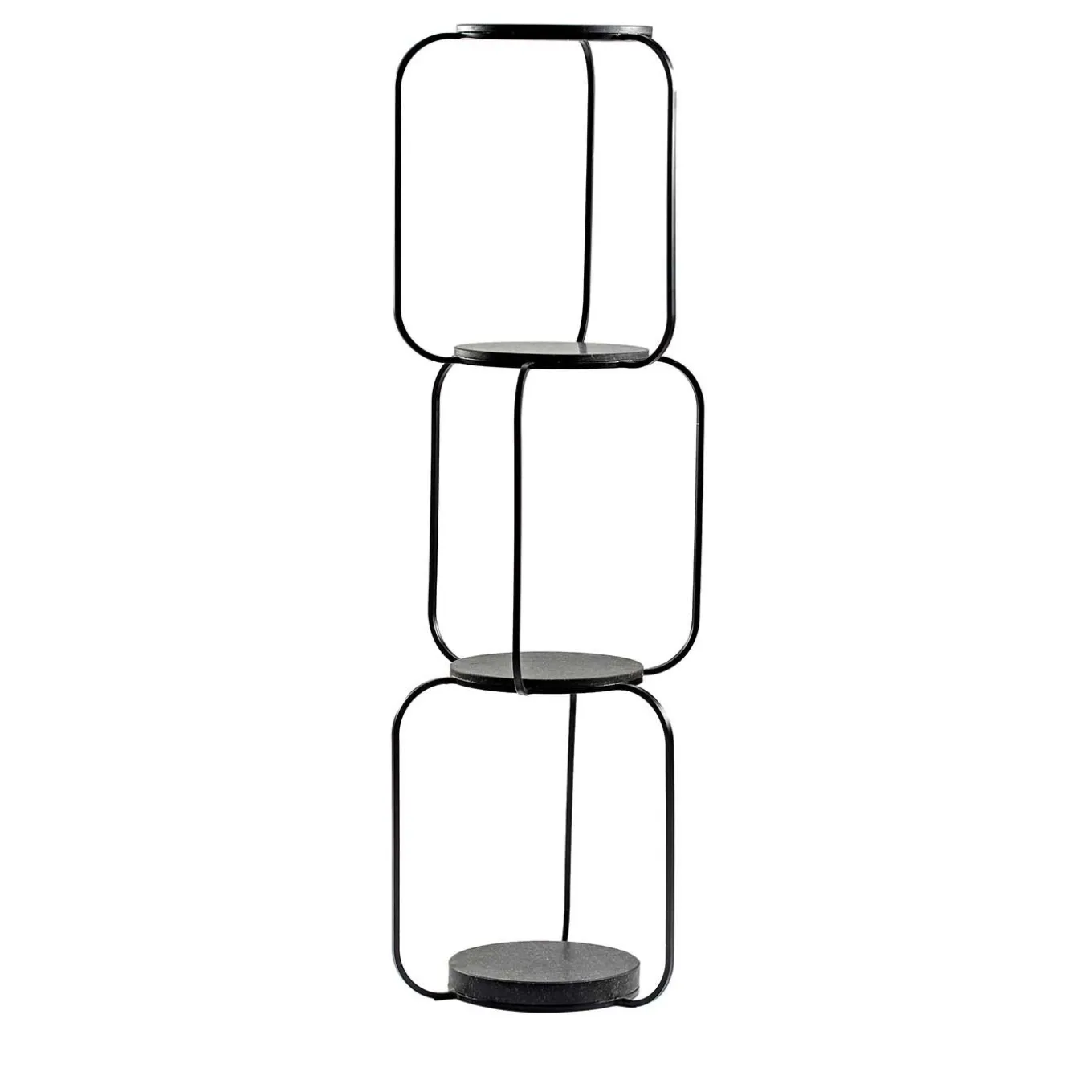 Parte della collezione Tarsie Geometriche, questa libreria è un capolavoro scultoreo. Verniciata con una polvere nera opaca, la struttura lineare in ferro crea una silhouette di grande impatto con quattro piani neri in pietra vulcanica con finitura levigata, incorporati nella struttura metallica tridimensionale, dando vita a un oggetto dinamico dal design funzionale.