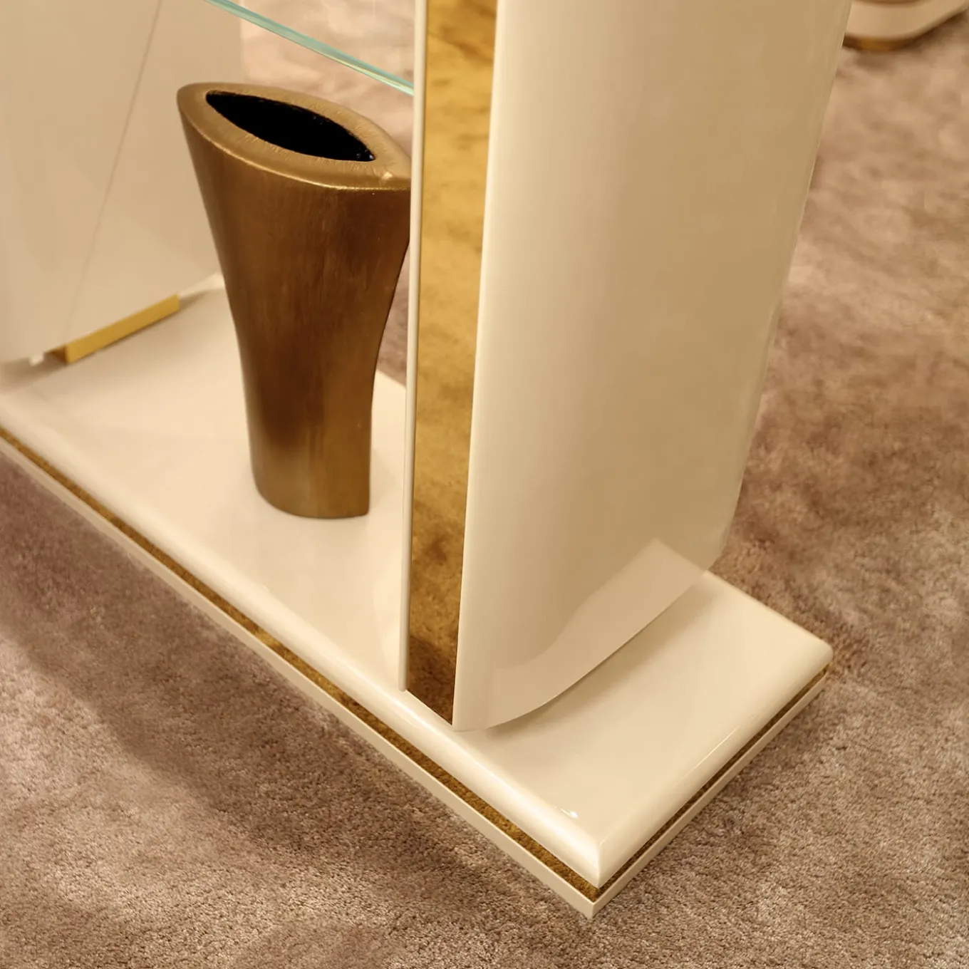 Elegante e versatile, la libreria Unique Collection presenta una struttura in legno con finitura laccata lucida Pearl Champagne, impreziosita da dettagli in metallo satinato oro. Cinque faretti LED integrati illuminano l’esposizione. Le dimensioni e il posizionamento dei ripiani in vetro sono personalizzabili per adattarsi al vostro spazio. Finiture personalizzate disponibili, contattare il Concierge per i dettagli.