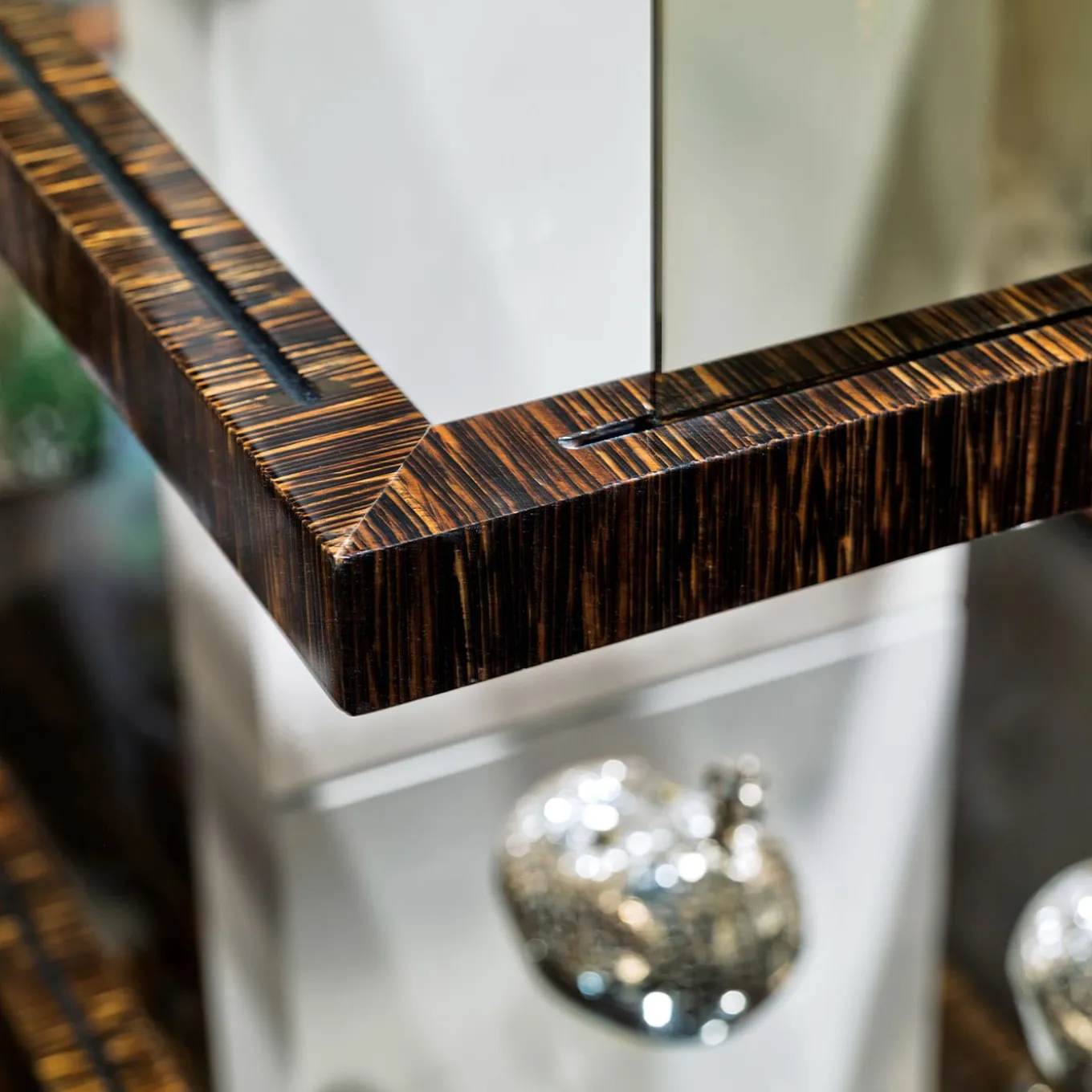 Un design asimmetrico di grande impatto visivo e dal carattere iconico descrive questa splendida libreria, realizzata in prezioso legno di palma e arricchita da pannelli scorrevoli in vetro fumé. La struttura è in legno laccato. Per ulteriori dettagli e possibili personalizzazioni, consultare il Concierge.
