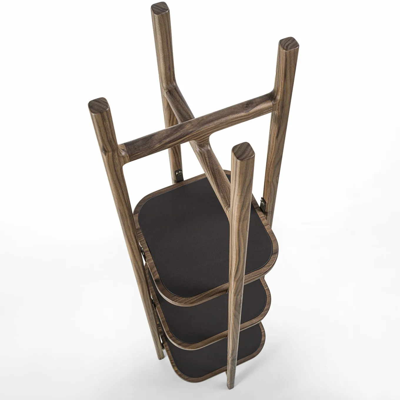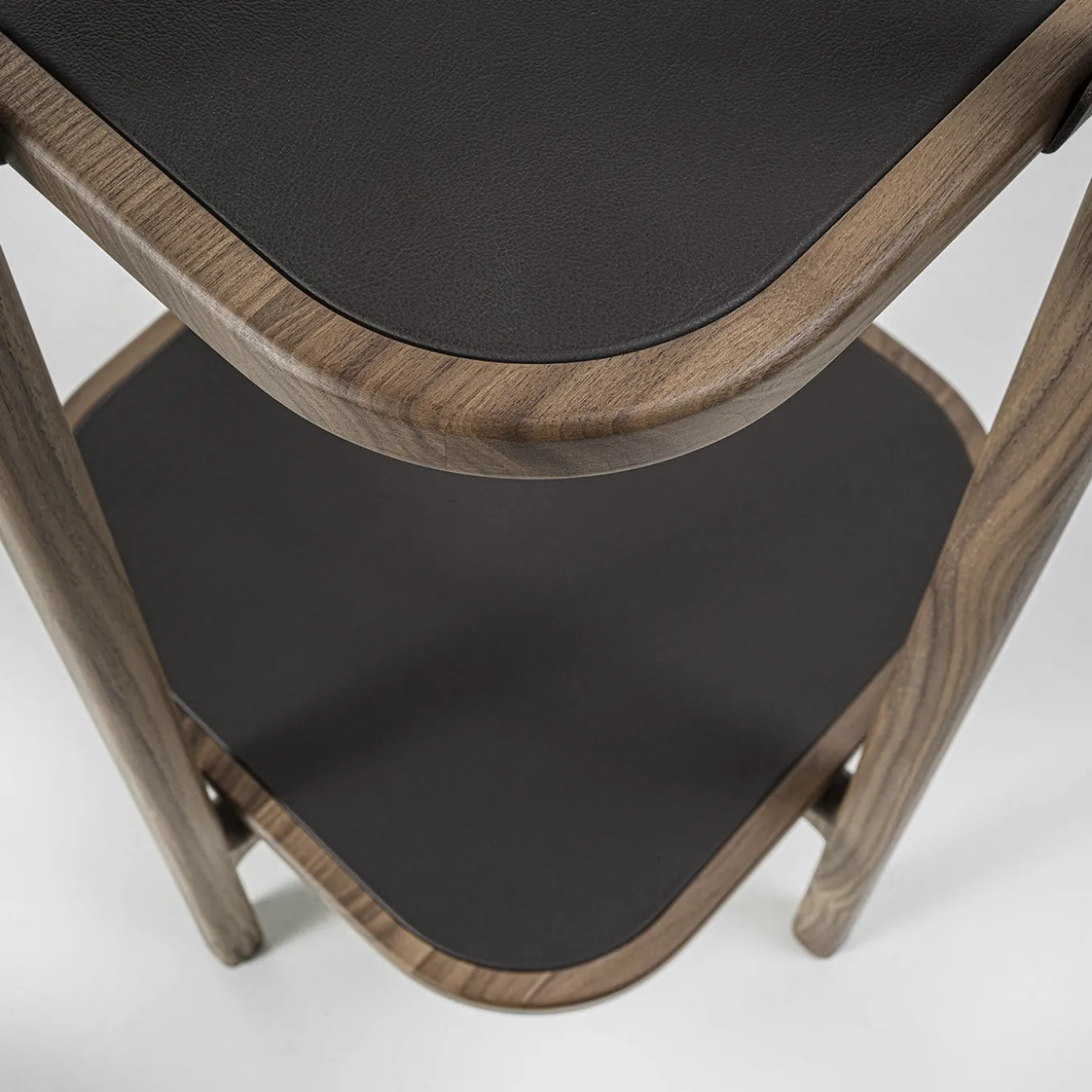 La libreria Salina a tre livelli in legno di noce presenta una struttura raffinata con barre verticali e orizzontali che creano una silhouette sinuosa. Ogni ripiano è incorniciato in legno con un piano in pelle e supportato da distintivi supporti in pelle adornati da bronzo, aggiungendo un dettaglio elegante. Questo mobile a scaffale aperto unisce funzionalità a una squisita lavorazione artigianale, perfetto per organizzare libri e oggetti decorativi con stile.