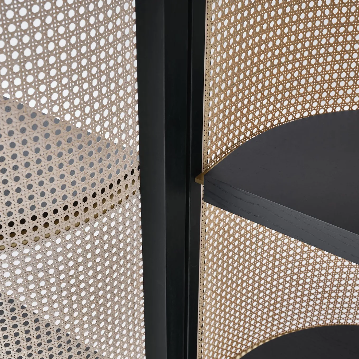 Una coppia di cornici curve in frassino tinto moka arricchite da paglia di Vienna caratterizzano questa libreria dal design accattivante che evoca raffinate atmosfere orientali. Ripiani di forma coordinata e un mobile contenitore chiuso a due ante, entrambi realizzati in MDF rivestito di frassino moka, completano la silhouette ariosa, elegantemente arricchita da dettagli in metallo dorato opaco.
