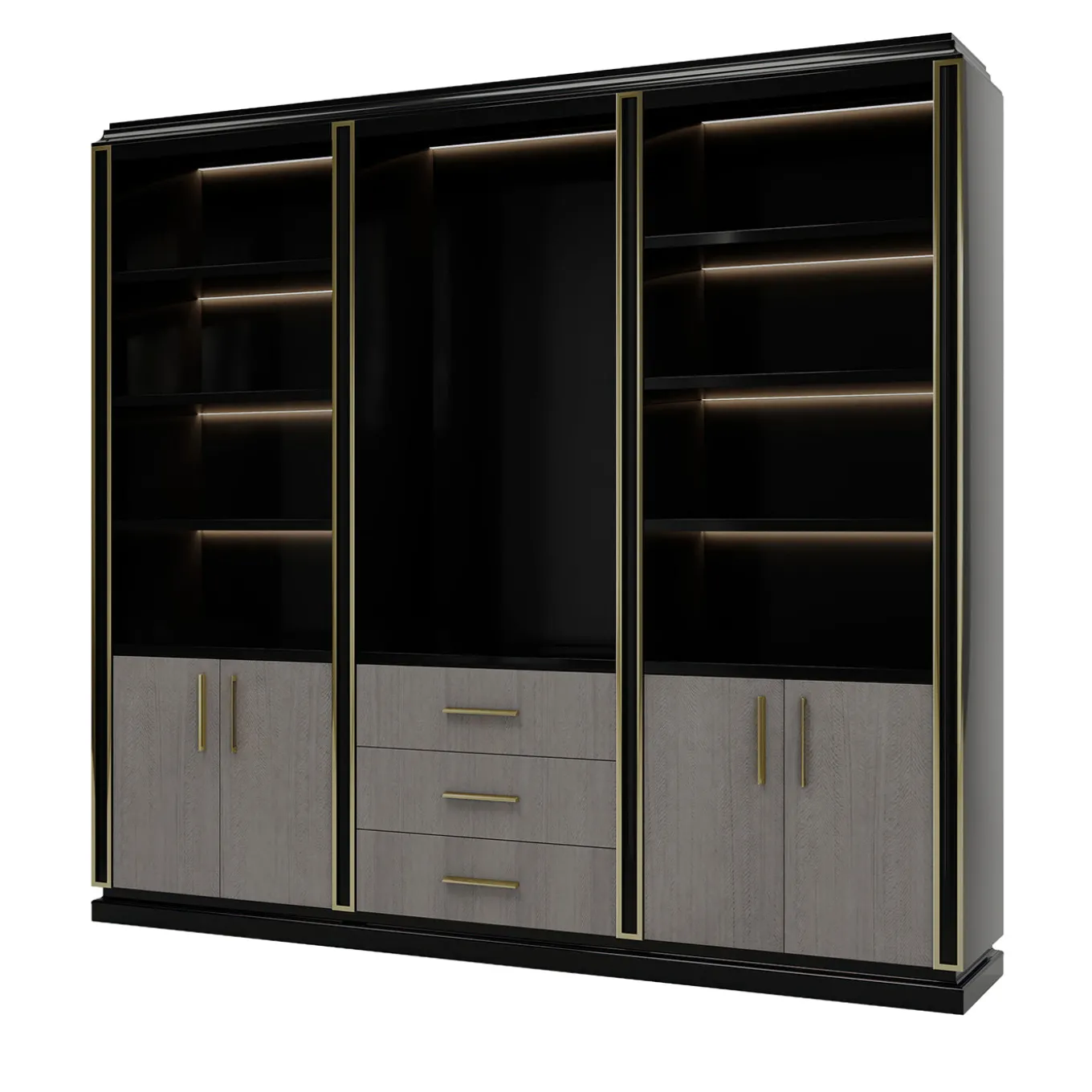 Questa libreria combina una struttura modulare in lacca marrone nera con porte in eucalipto naturale, offrendo un sofisticato mix di design contemporaneo e raffinata artigianalità. La sua alta statura si adatta a spazi di lavoro domestici ampi o ambienti commerciali, presentando un layout equilibrato di ripiani aperti e compartimenti chiusi per una presentazione organizzata. Arricchita da dettagli in foglia d’oro e maniglie in metallo, offre sia eleganza che funzionalità pratica. Le luci a LED sono opzionali e disponibili a un costo aggiuntivo. Si prega di contattare il concierge per ulteriori informazioni.