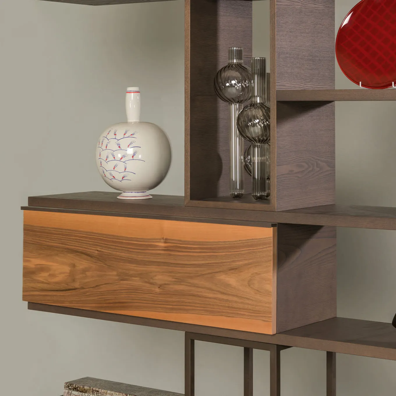 Straordinario gioco di linee e prospettive, questa libreria disegnata da Libero Rutilo fonde il valore architettonico senza tempo con il design contemporaneo. La sua caratteristica struttura è realizzata a mano in legno di frassino, con vani aperti e chiusi, questi ultimi completati da ante in acero, noce, ciliegio, padouk ed ebano Makassar. La struttura è arricchita da vani a giorno in ferro.